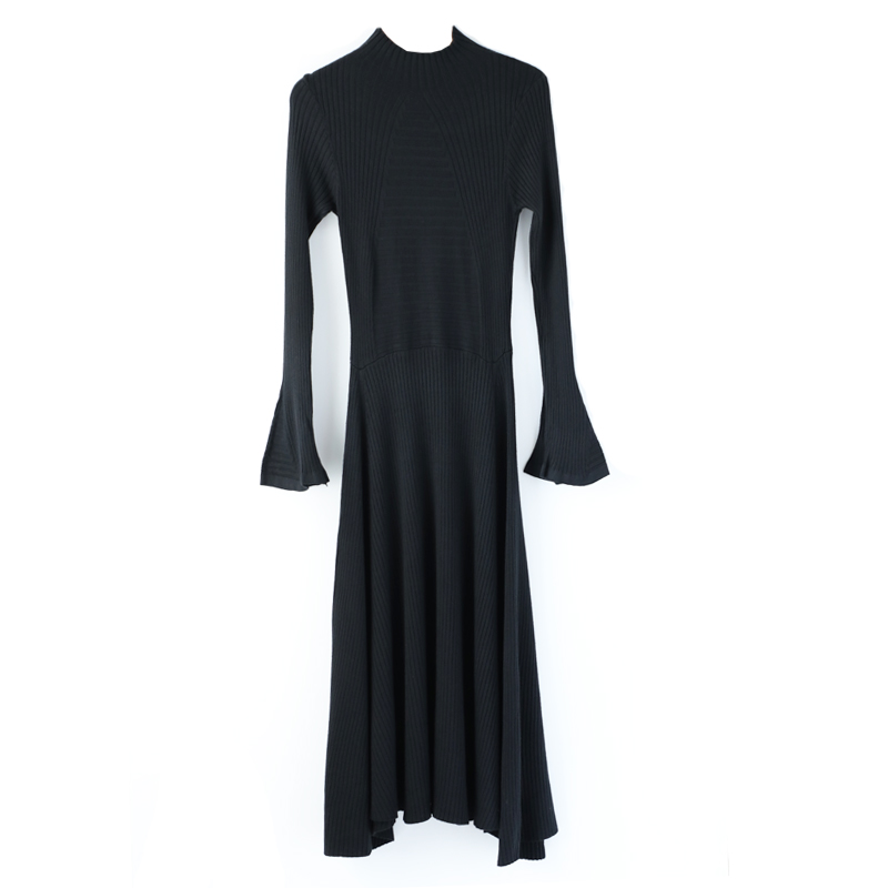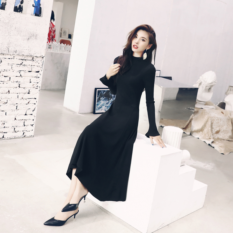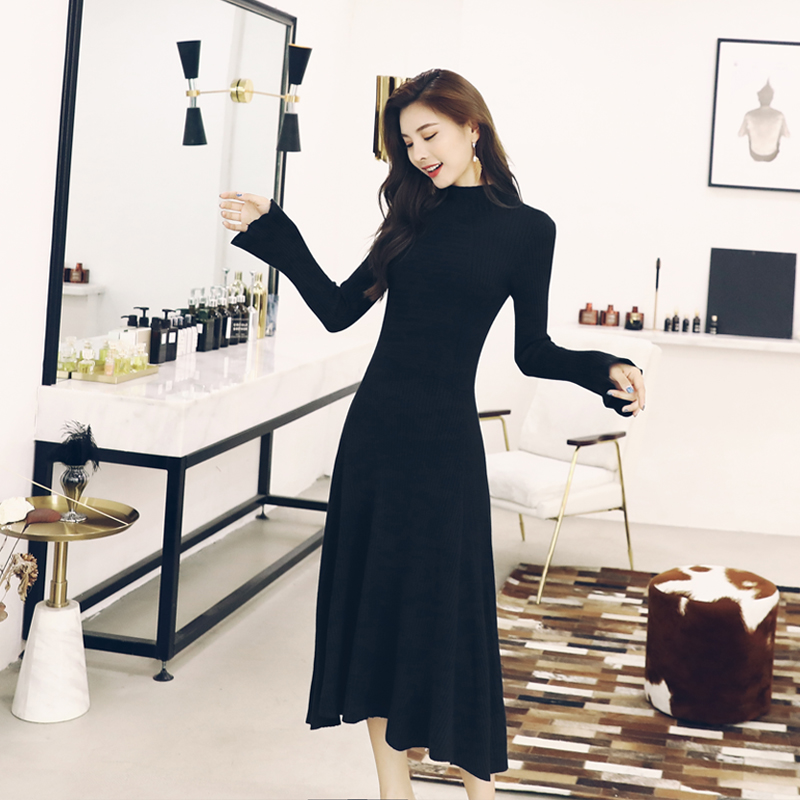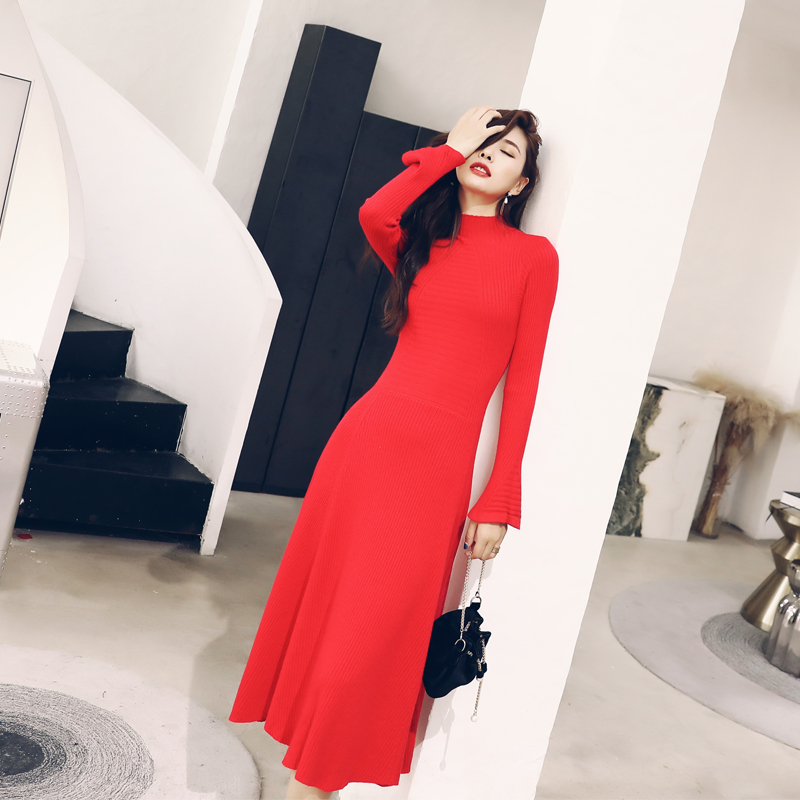 秋裝女2018新款初戀裙復古喇叭長袖針織連衣裙中長款冬季打底裙潮