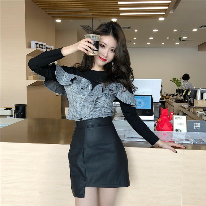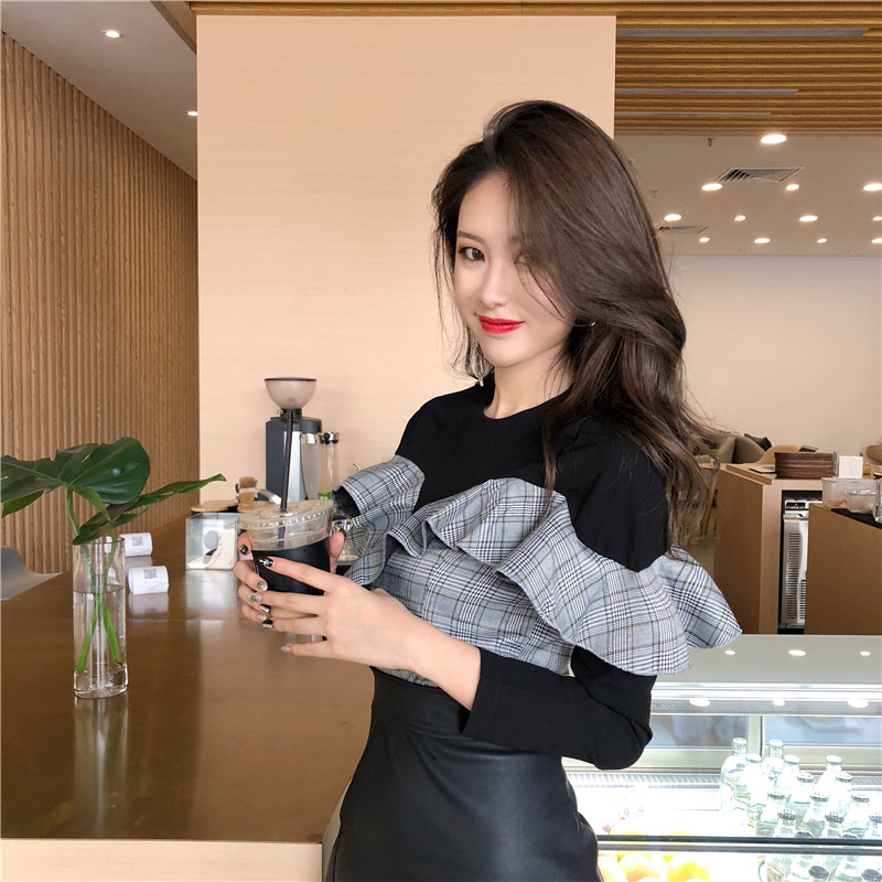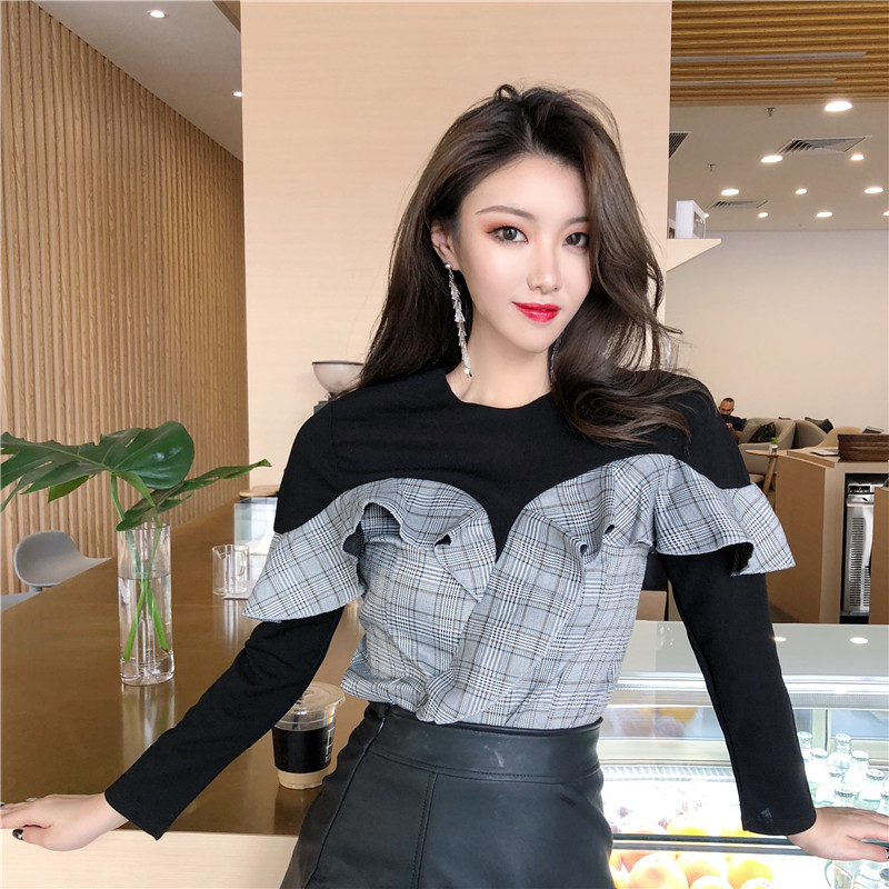 / 2018秋季新款氣質設計感時尚短款修身荷葉邊格子拼接假兩件上衣女