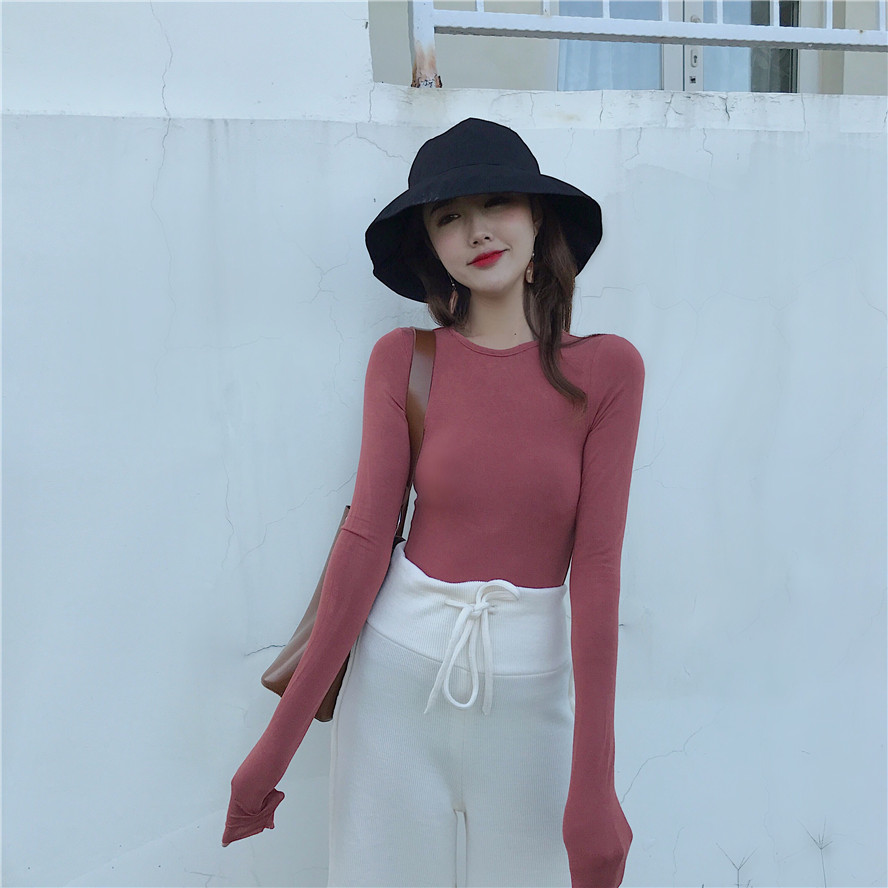 / 韓國秋季新款純色百搭氣質打底衫長袖露背上衣復古chic緊身T恤女
