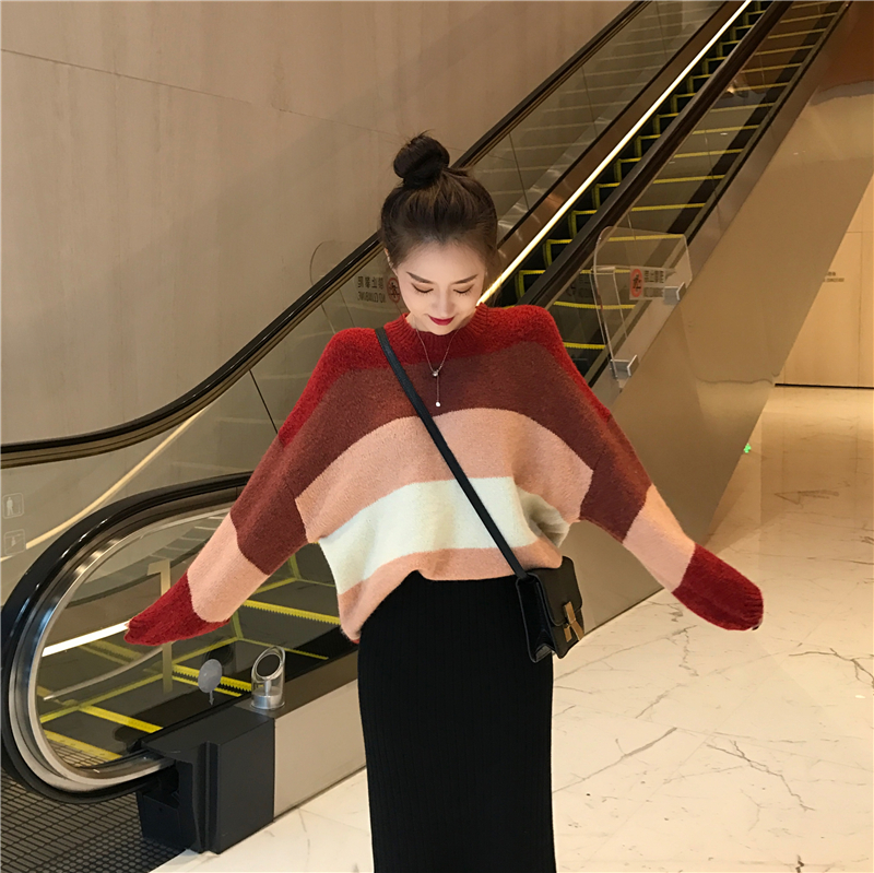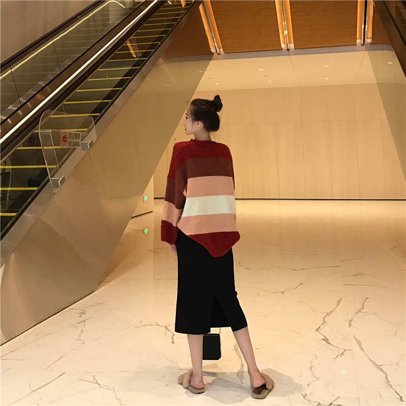 新款寬松慵懶溫柔拼色條紋毛衣時尚套裝開叉包臀裙半身裙兩件套女
