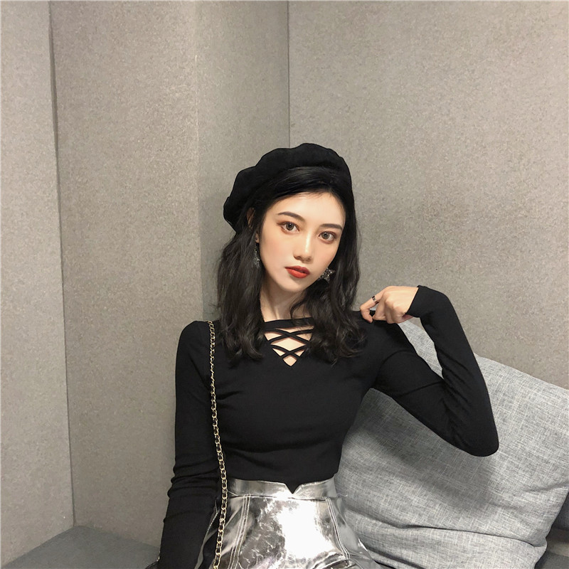 港味性感v領交叉鏤空顯瘦新款秋裝百搭復古氣質修身長袖t恤上衣女