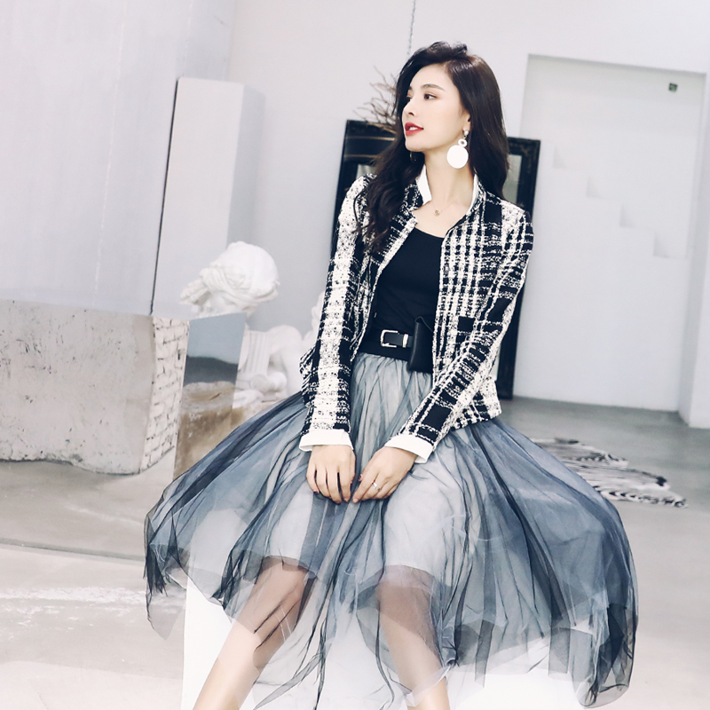 女西裝套裝2018新款兩件套氣質長袖小香毛呢上衣中長款網紗半身裙