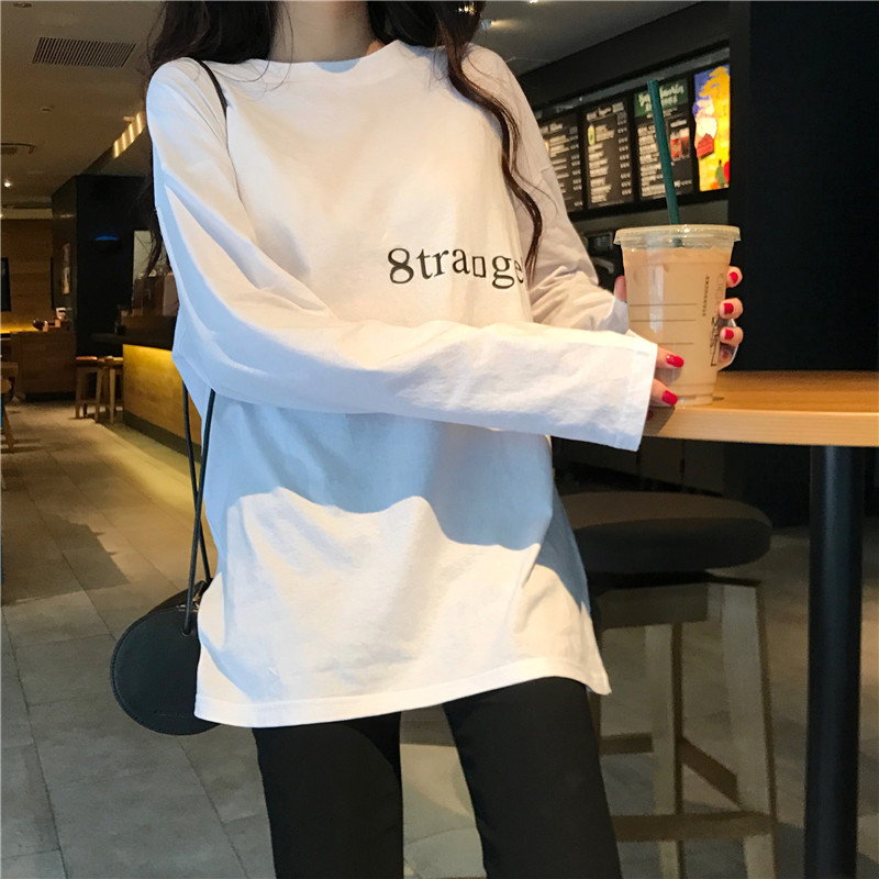 秋冬百搭新款韓版中長款顯瘦小清新chic字母印花寬松打底T恤上衣