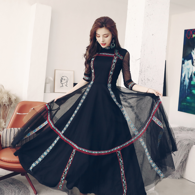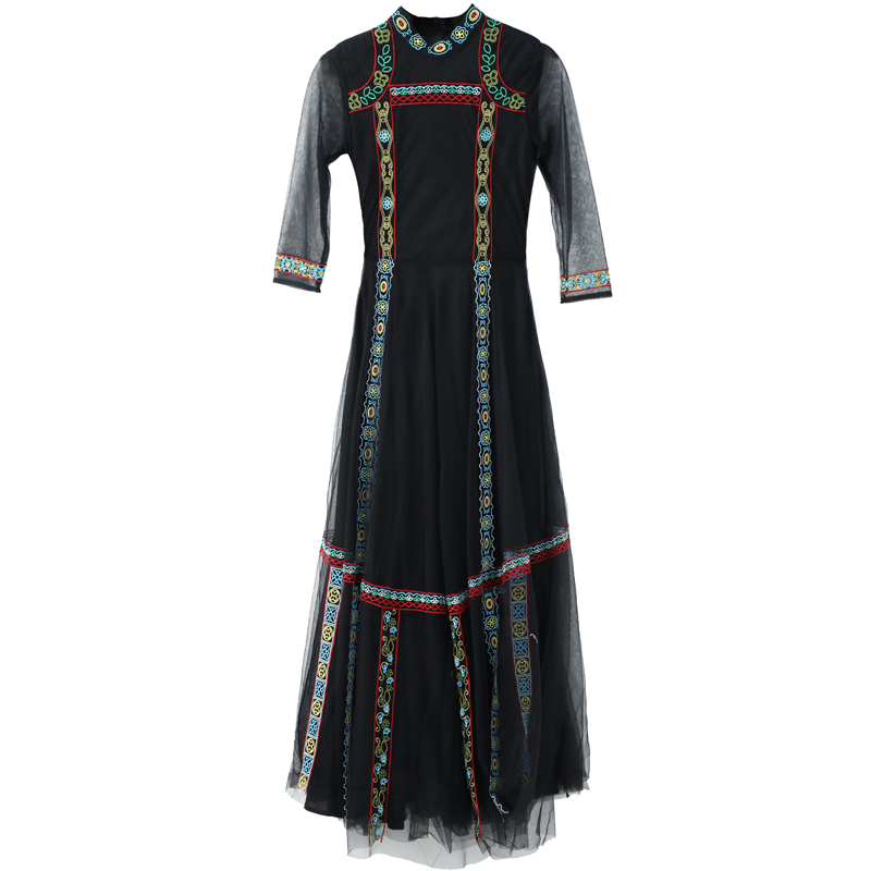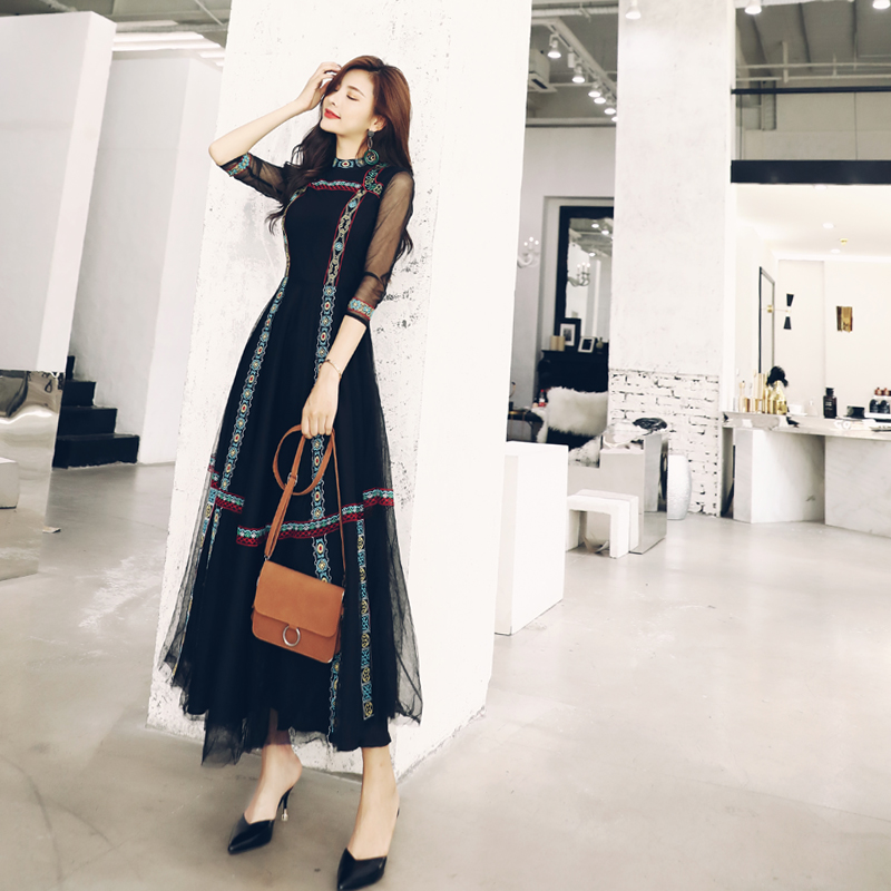 / 名媛氣質網紗刺繡歐洲站秋款連衣裙繡花長裙歐貨女神范中長款裙子