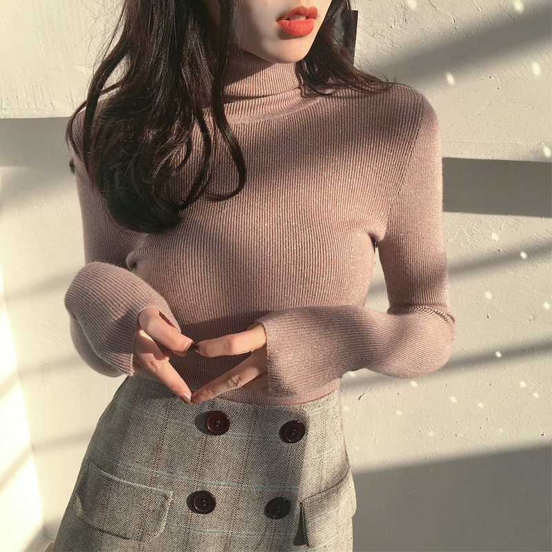 / 秋季新款chic韓版修身顯瘦高領亮絲針織衫港風女長袖毛衣打底上衣