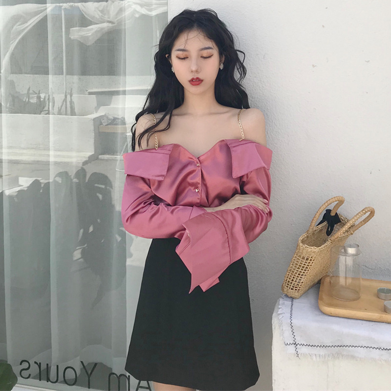 / 復古港味吊帶一字肩V領多穿紐扣chic新款心機襯衣百搭長袖上衣女