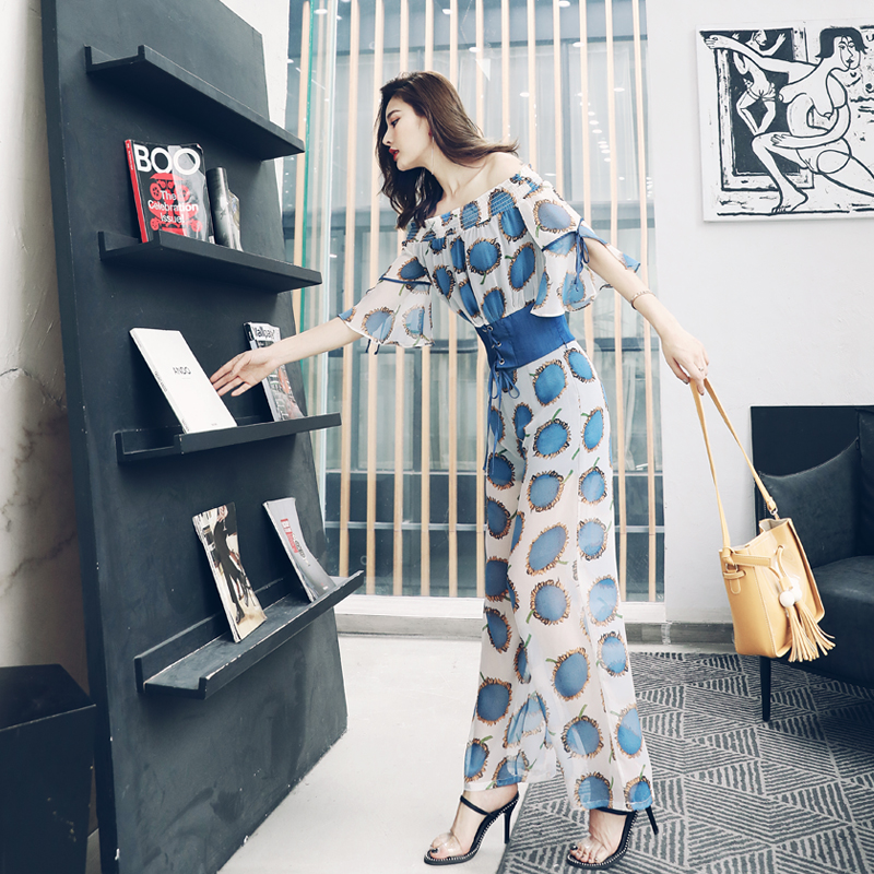 / S秀女神范雪紡套裝2018夏季新款時尚一字肩漏肩氣質闊腿褲兩件套