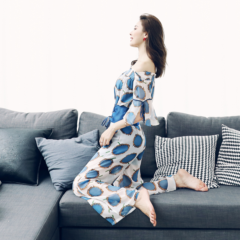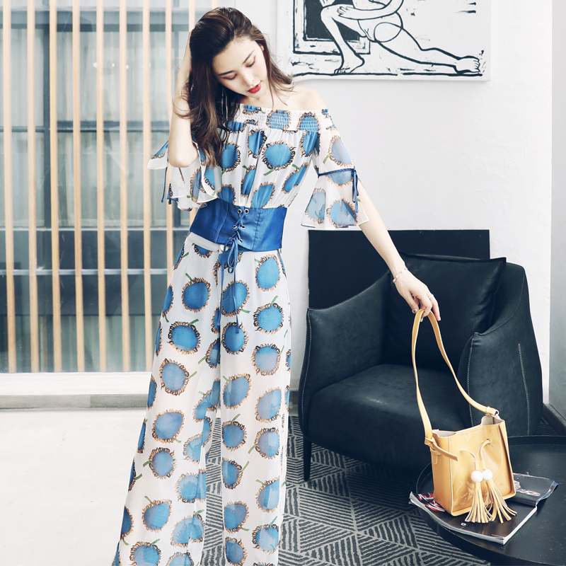 S秀女神范雪紡套裝2018夏季新款時尚一字肩漏肩氣質闊腿褲兩件套