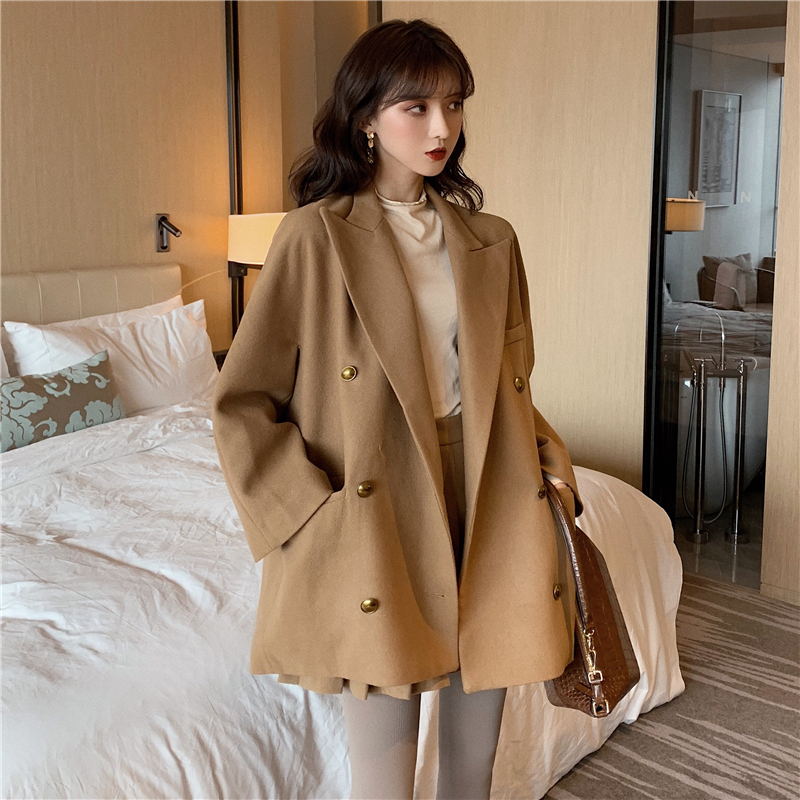 秋冬新款雙排扣呢子大衣外套時尚套裝呢子百褶裙褲chic氣質兩件套