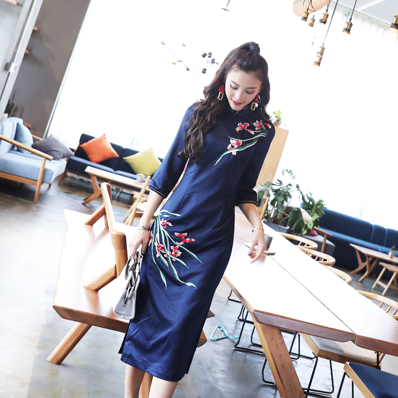 2018春季新款復古中式風修身收腰繡花鏤空旗袍通勤立領中長裙子潮