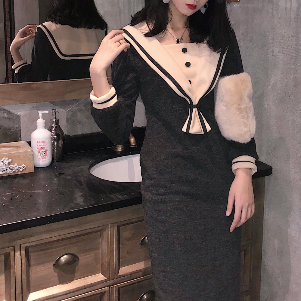 2018韓版秋裝新款時尚中長裙復古chic百搭氣質水手服打底連衣裙女