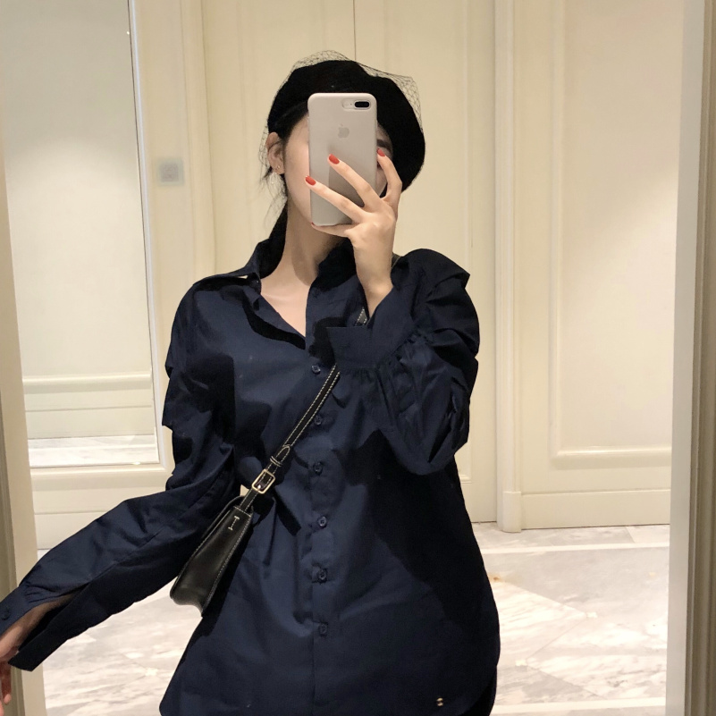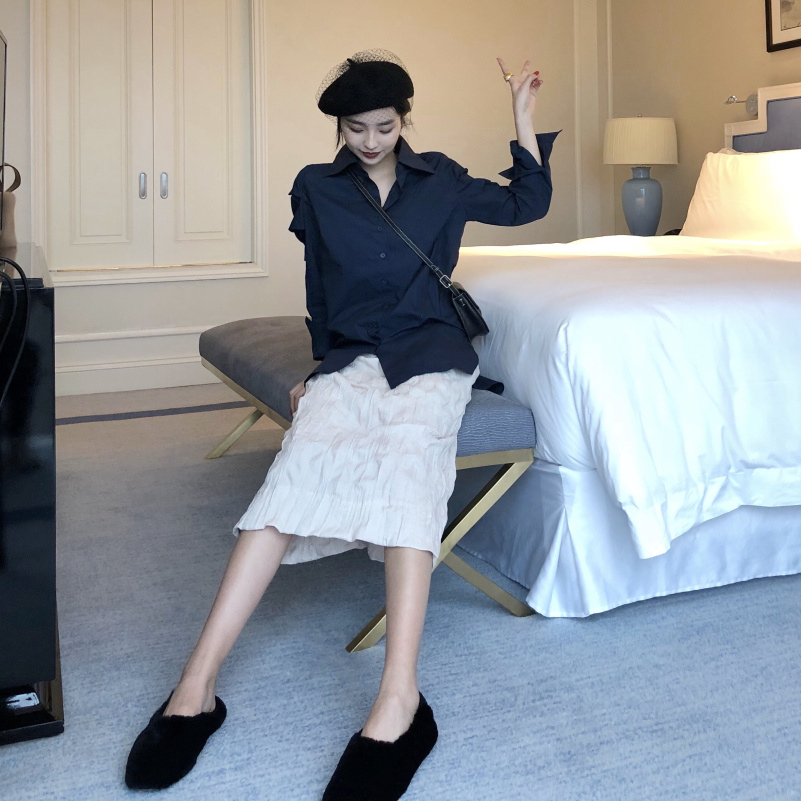 / 新款韓版袖子設計感寬松長袖襯衫時尚套裝高腰褶皺中長款半身裙女