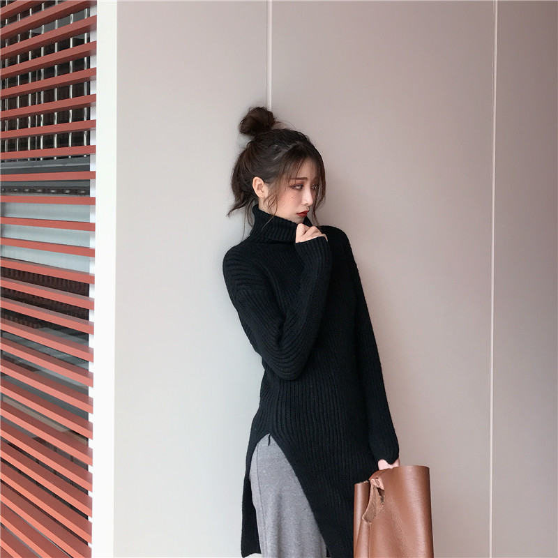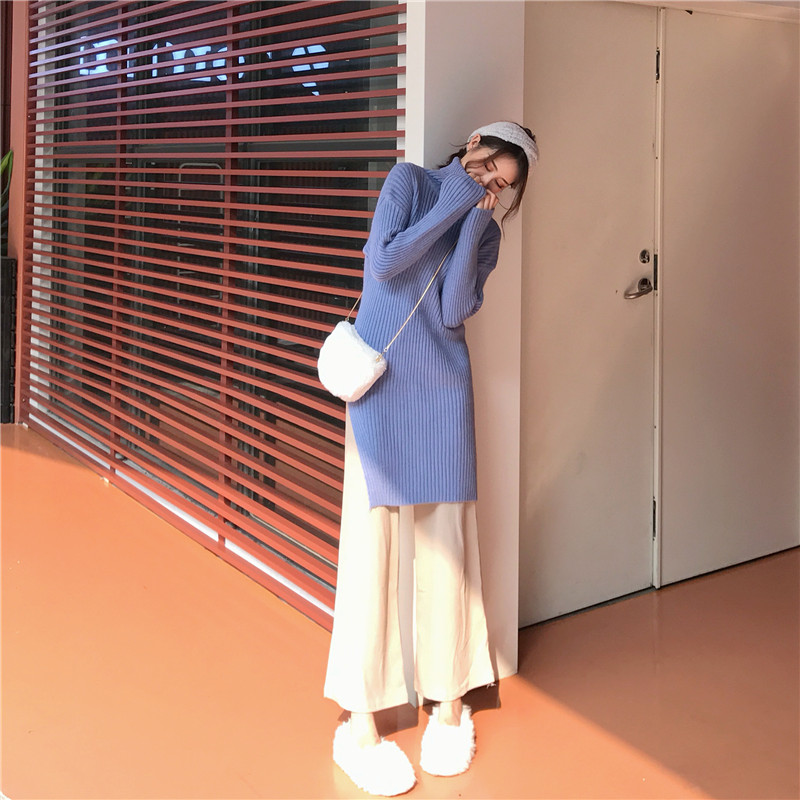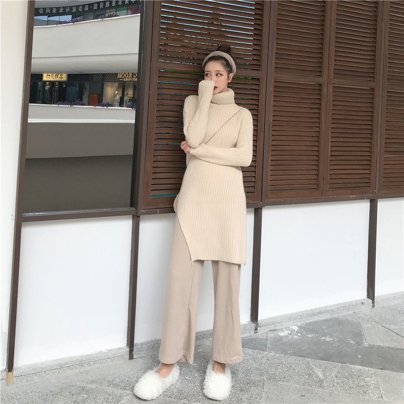 慵懶高領針織開叉毛衣女秋冬2018新款+ 純色休閑褲闊腿褲長褲套裝