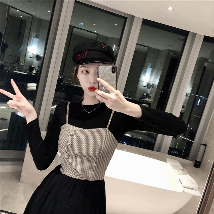 / 時尚套裝秋季新款女復古氣質打底連衣裙小心機吊帶格子抹胸兩件套