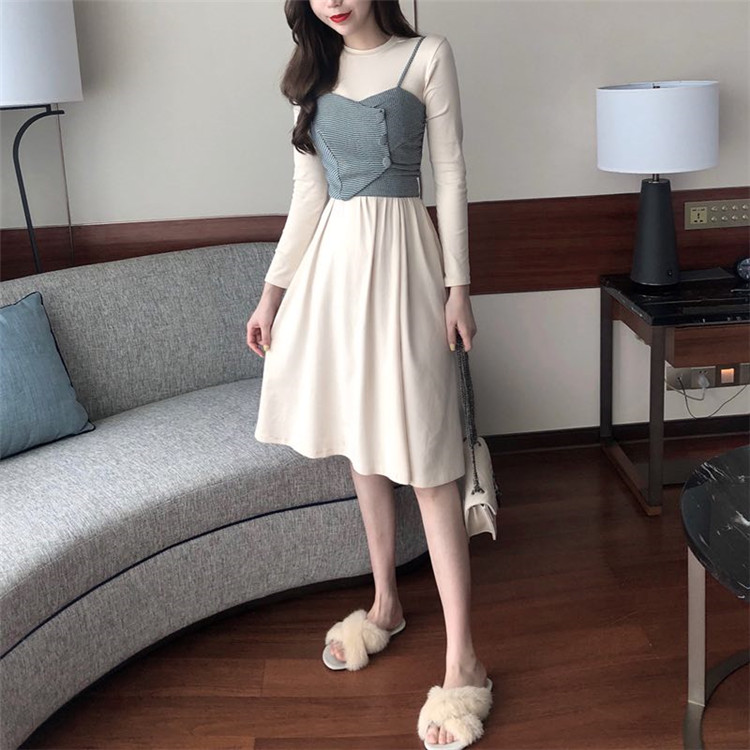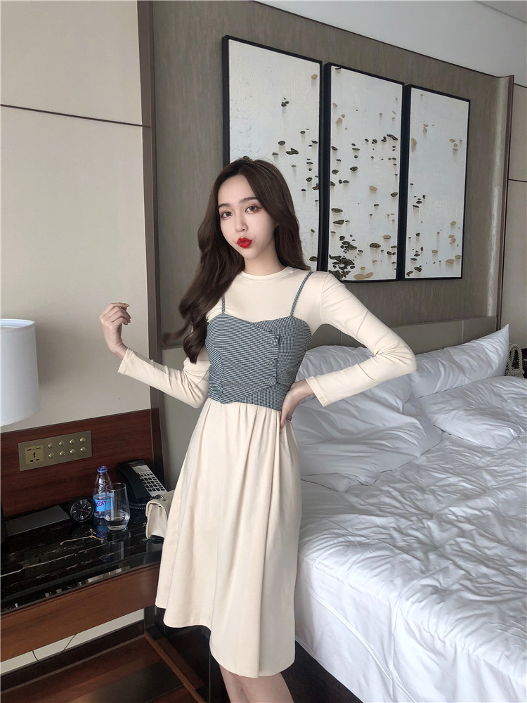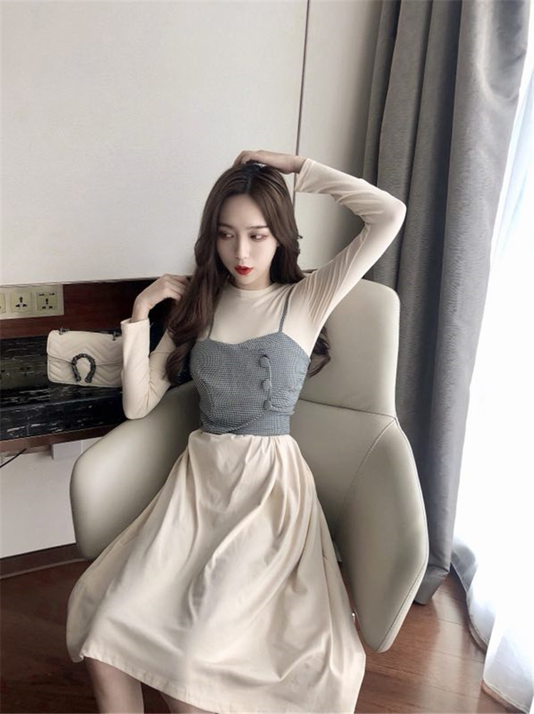 時尚套裝秋季新款女復古氣質打底連衣裙小心機吊帶格子抹胸兩件套