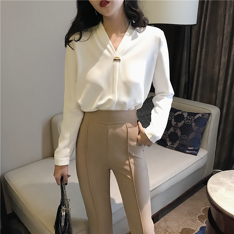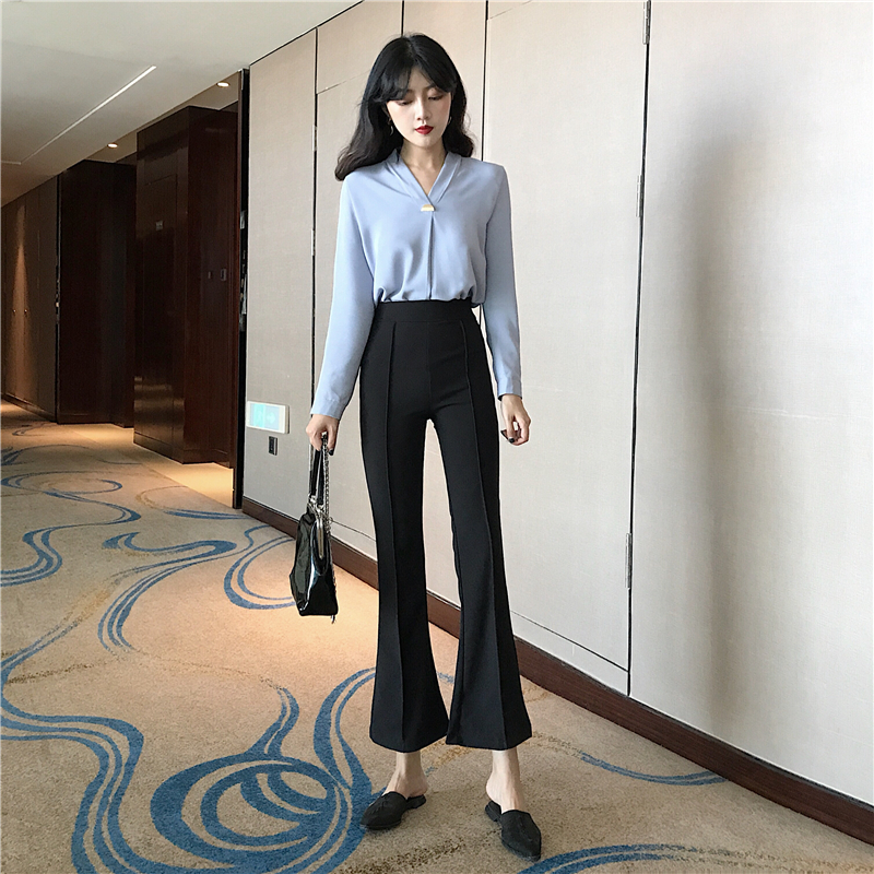 新款韓版高腰顯瘦微喇長褲氣質V領一粒扣雪紡襯衫時尚套裝兩件套