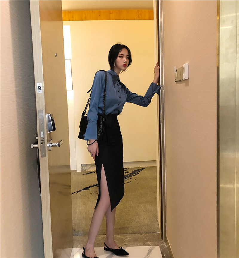 / 2018秋裝新款韓版百搭襯衣長袖高腰蝴蝶結開叉包臀裙套裝兩件套女
