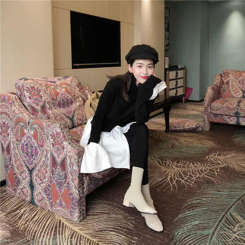 秋季新款韓版設計感假兩件拼色半高領不規則喇叭袖襯衫針織衫上衣