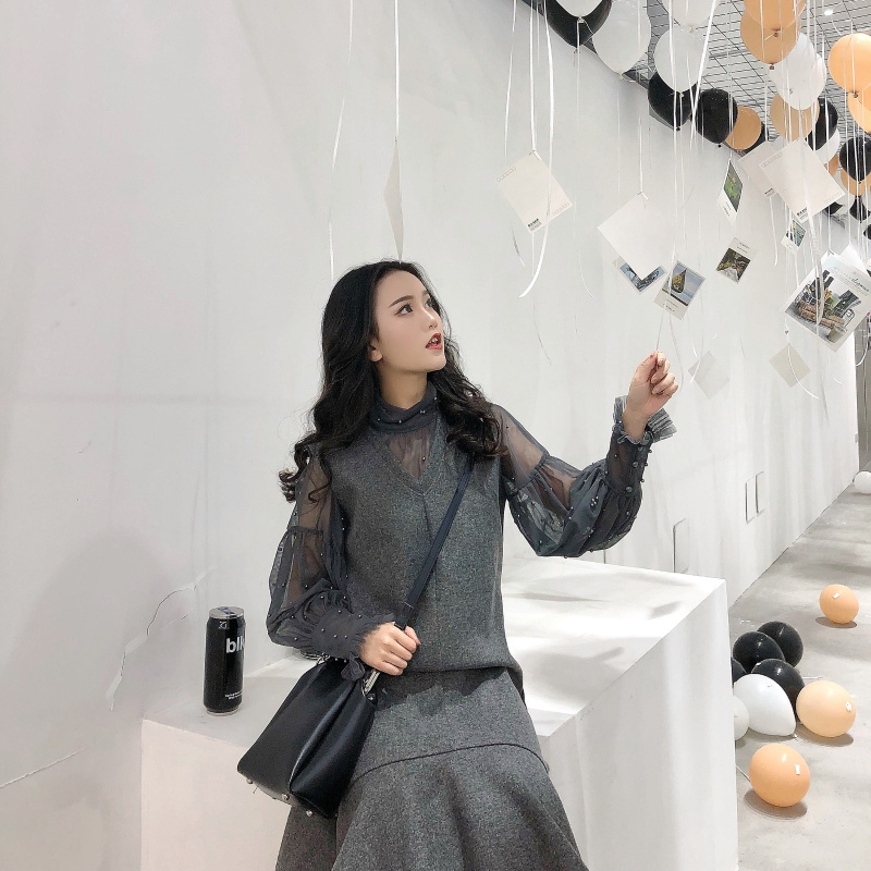 chic小清新氣質新款長袖雪紡衫百搭魚尾背心連衣裙時尚套裝兩件套