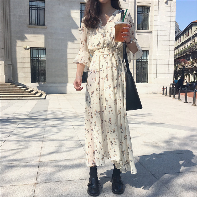 / 秋裝女裝韓版氣質小清新喇叭袖短袖碎花雪紡連衣裙a字打底裙長裙