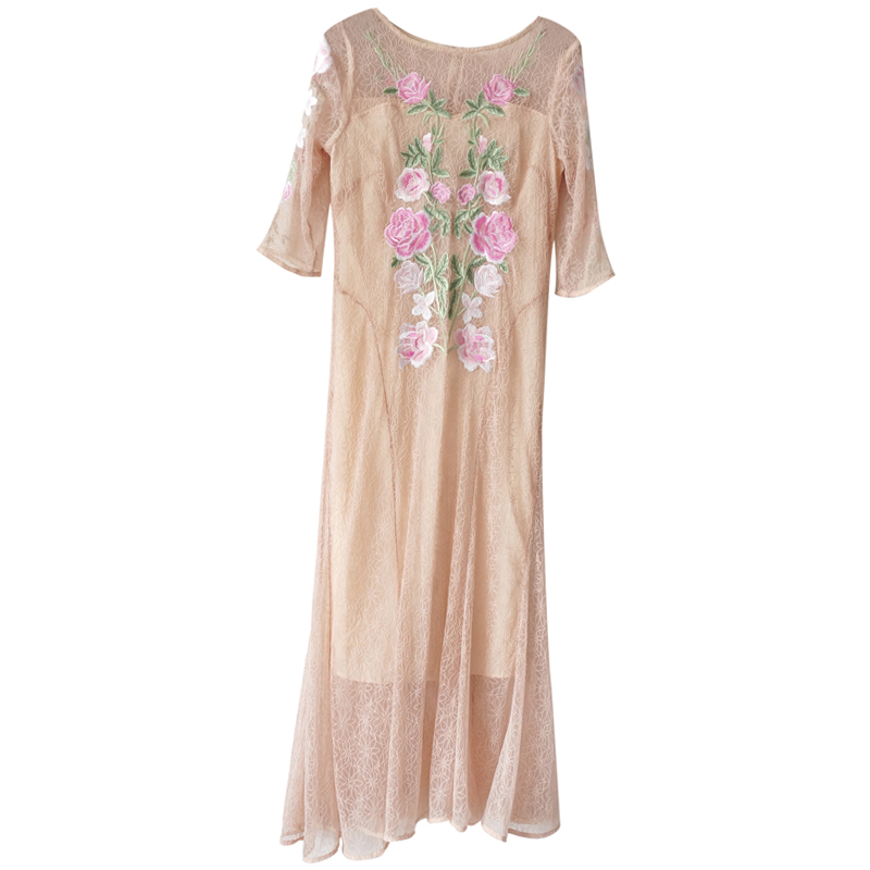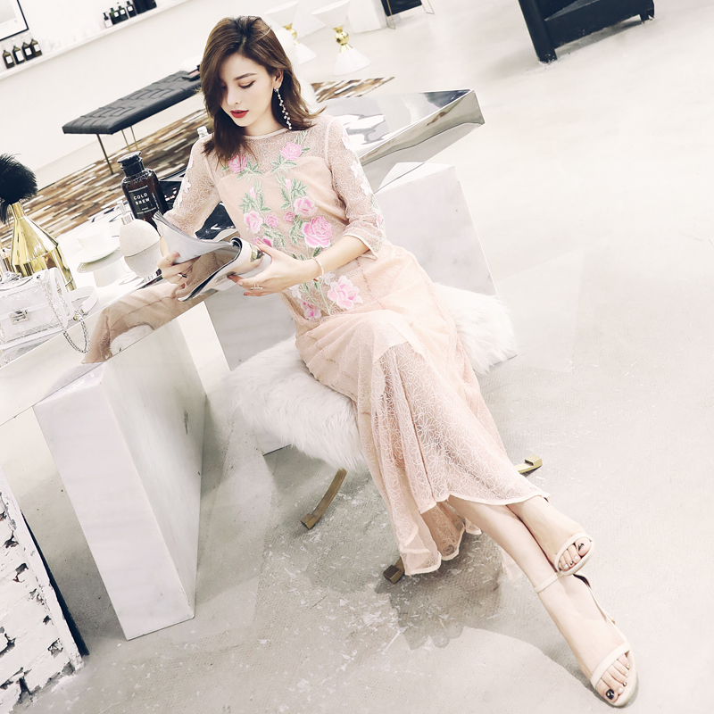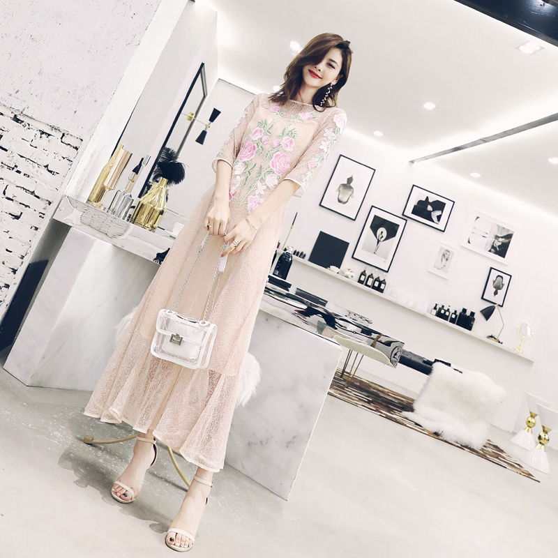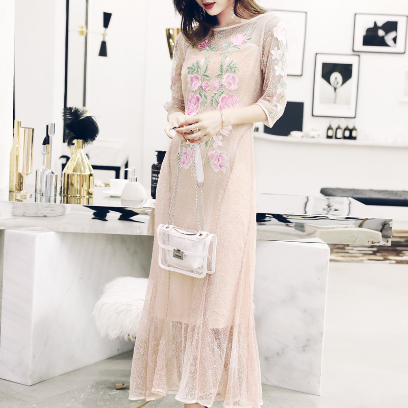S秀2018夏季新款名媛氣質復古蕾絲鏤空刺繡連衣裙子高腰長裙女夏