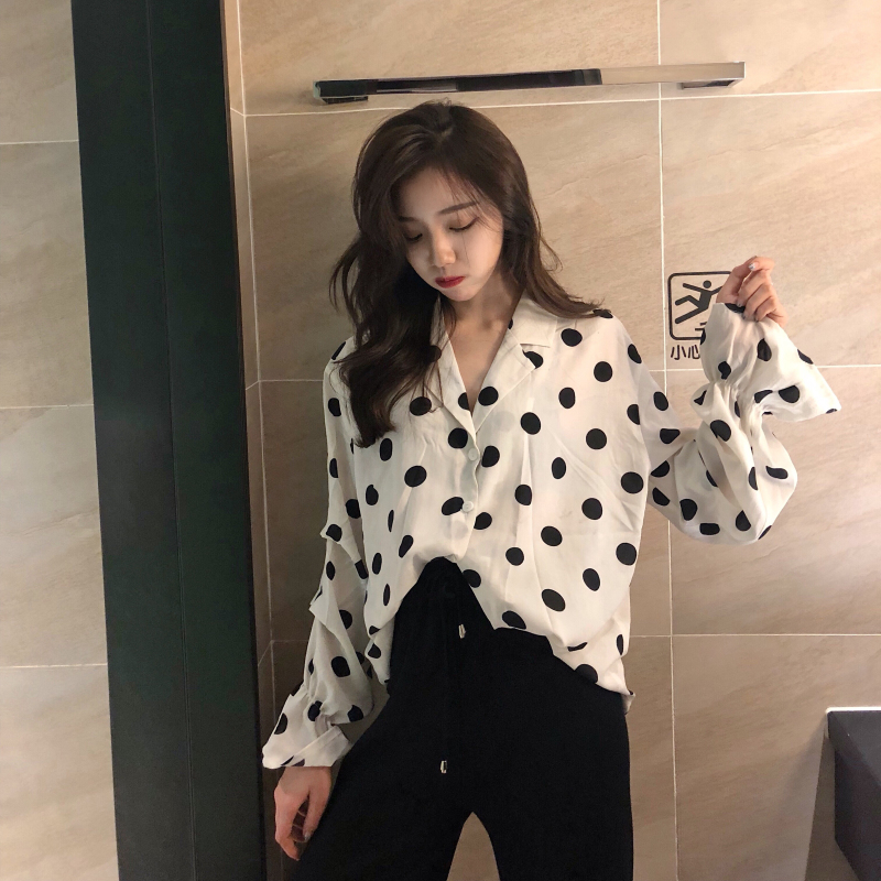 波點上衣|黑色長褲
