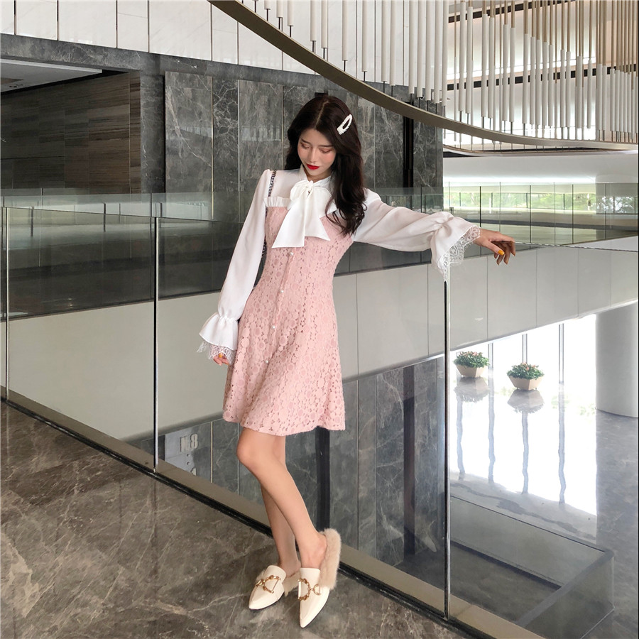 / 小香風2018新款韓版甜美百搭系帶蝴蝶結蕾絲拼接雪紡收腰連衣裙女