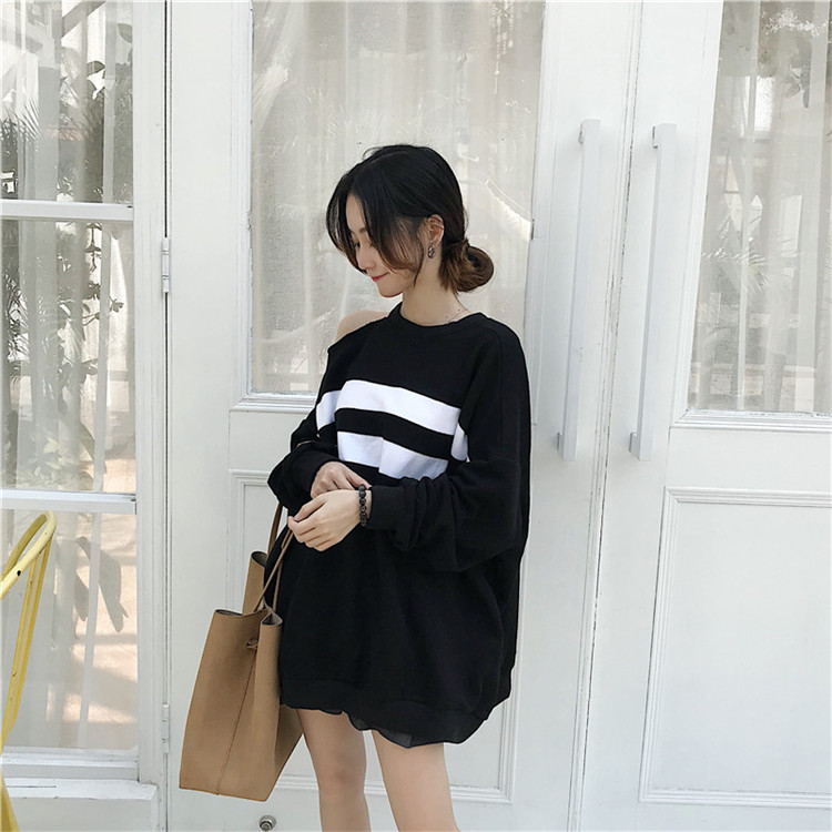 / 秋季女裝韓版中長款拼接條紋露肩寬松套頭衛衣長袖休閑上衣外套潮