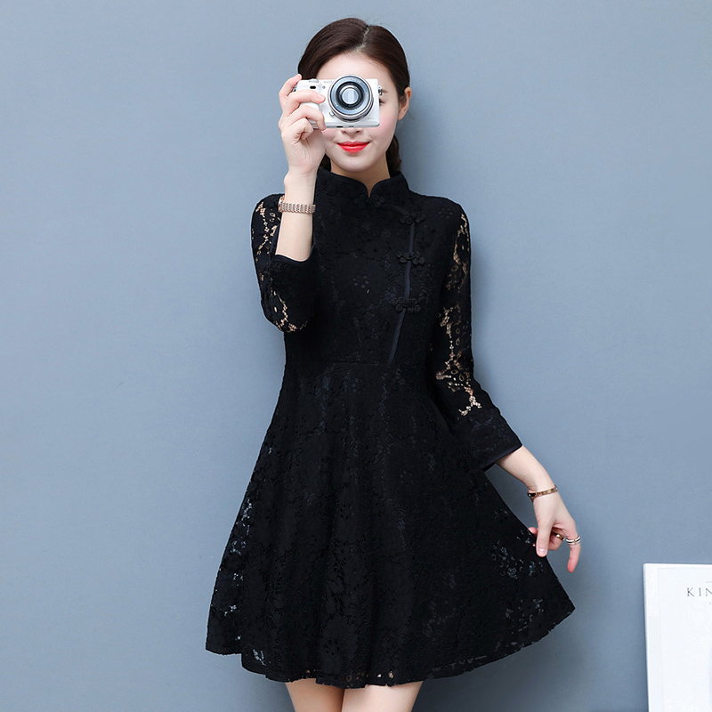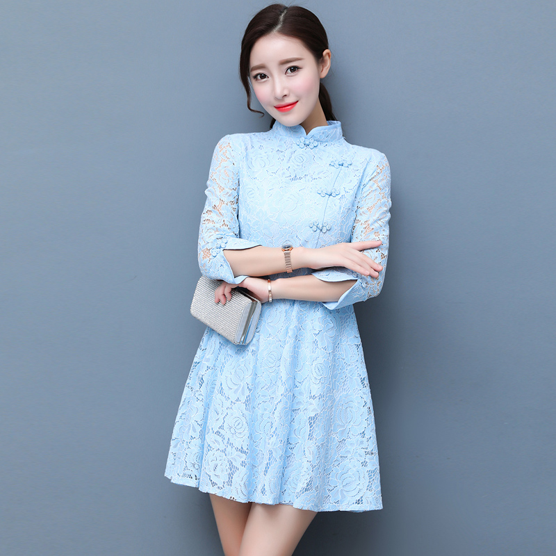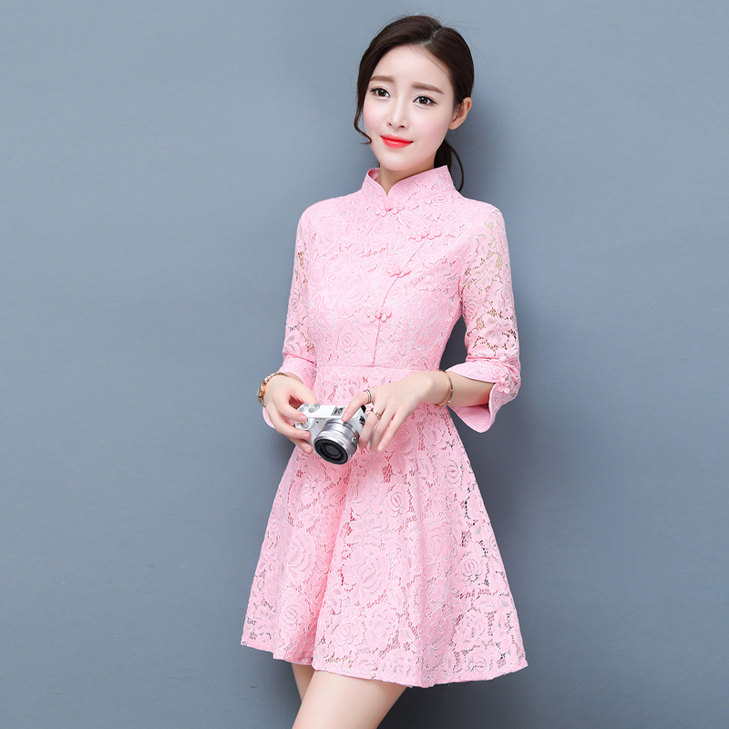 / 夏季韓版顯瘦旗袍蕾絲時尚連衣裙女鏤空收腰七分袖A字裙中裙