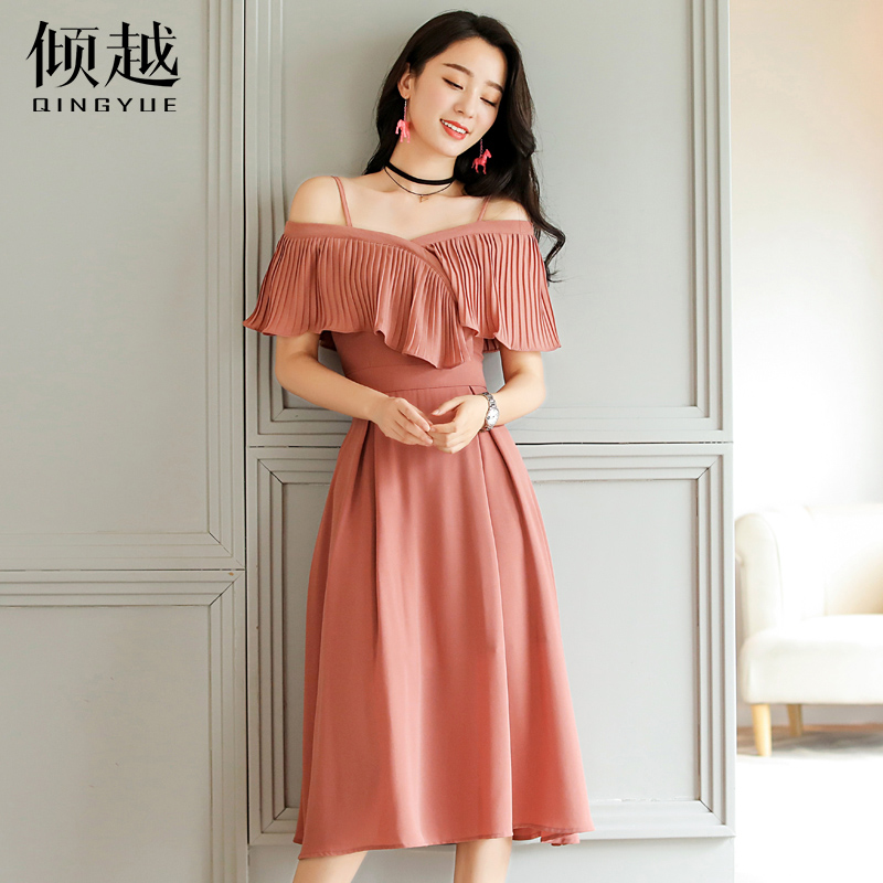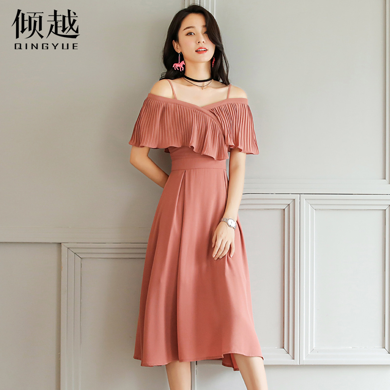 2017新款時尚顯瘦一字領露肩連衣裙長裙女韓版中長款吊帶裙子夏潮