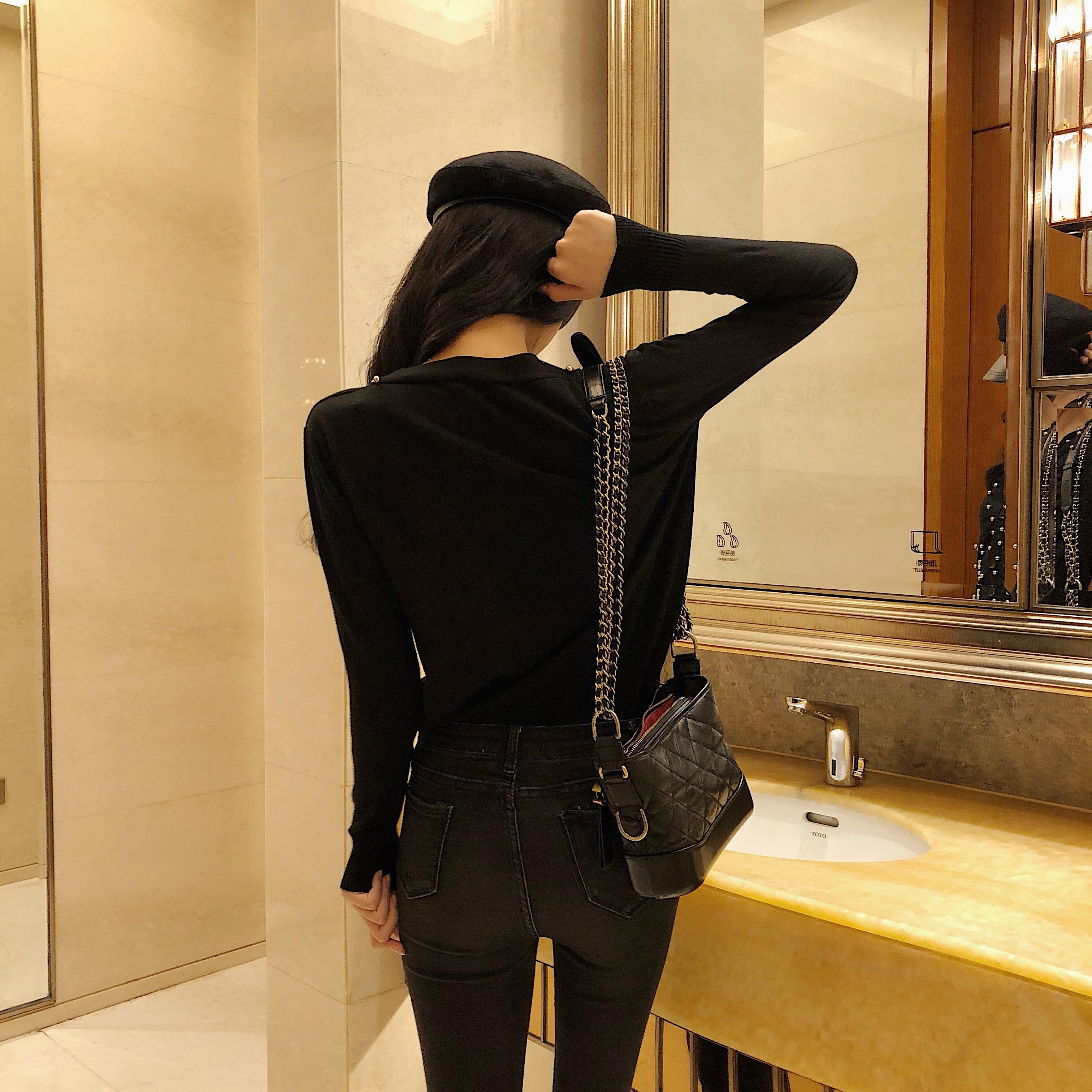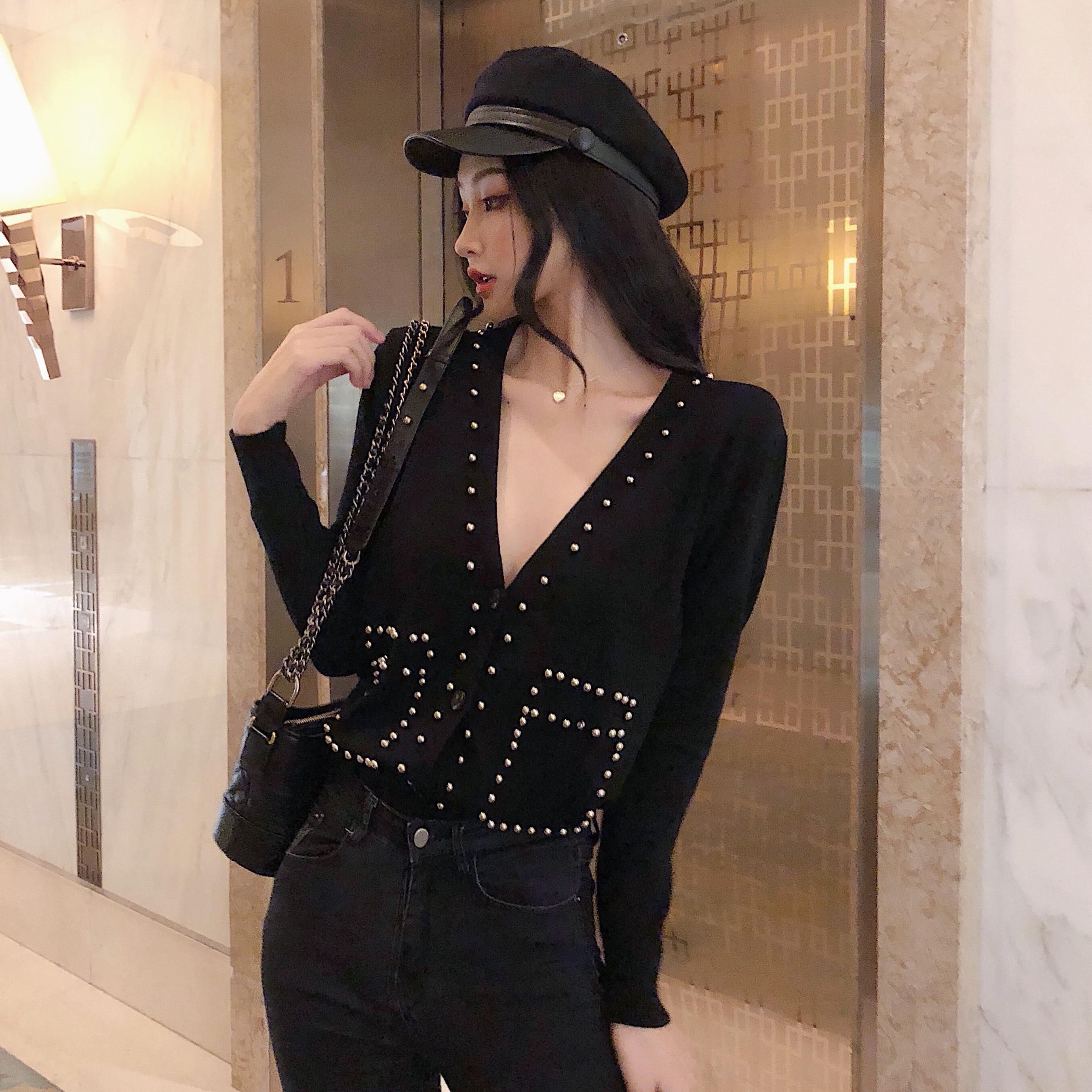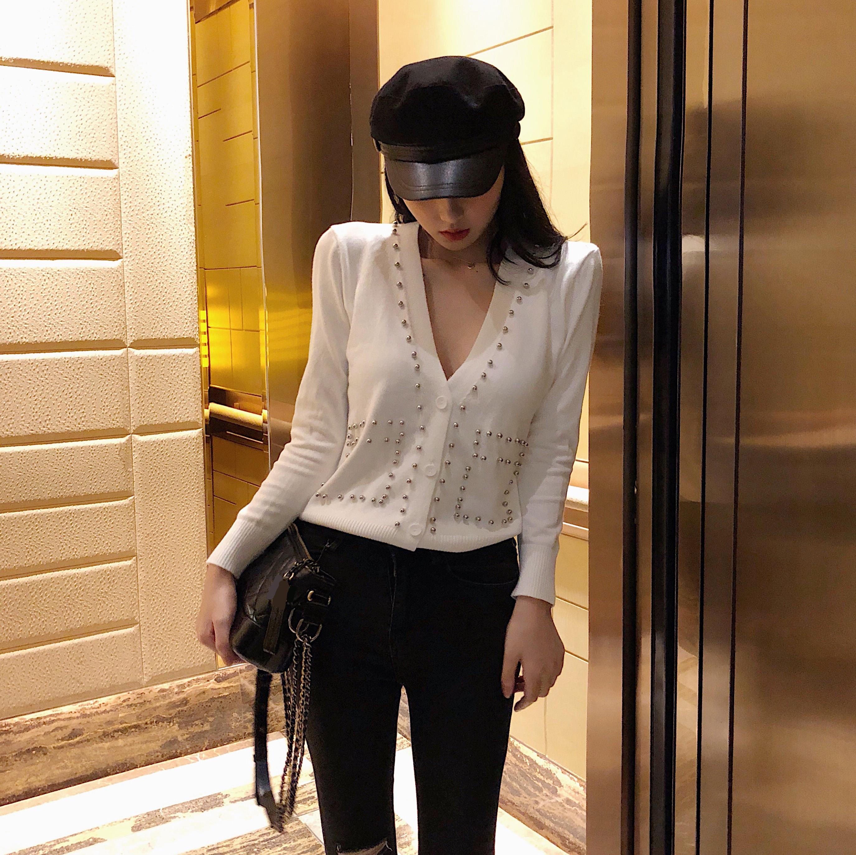 / 2018年秋款氣質純色重工釘珠v領單排扣設計感小心機針織開衫上衣