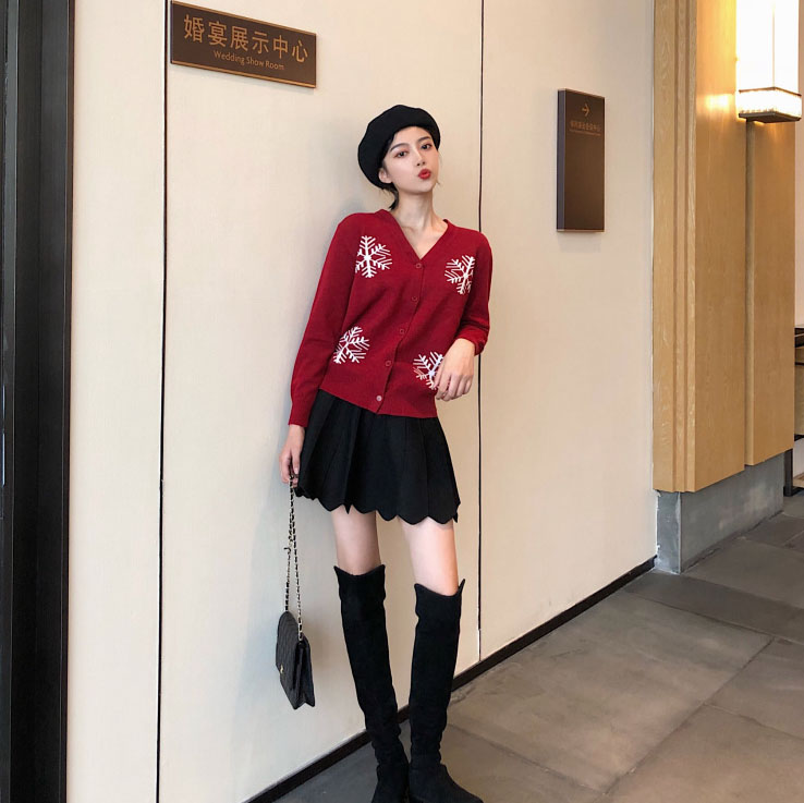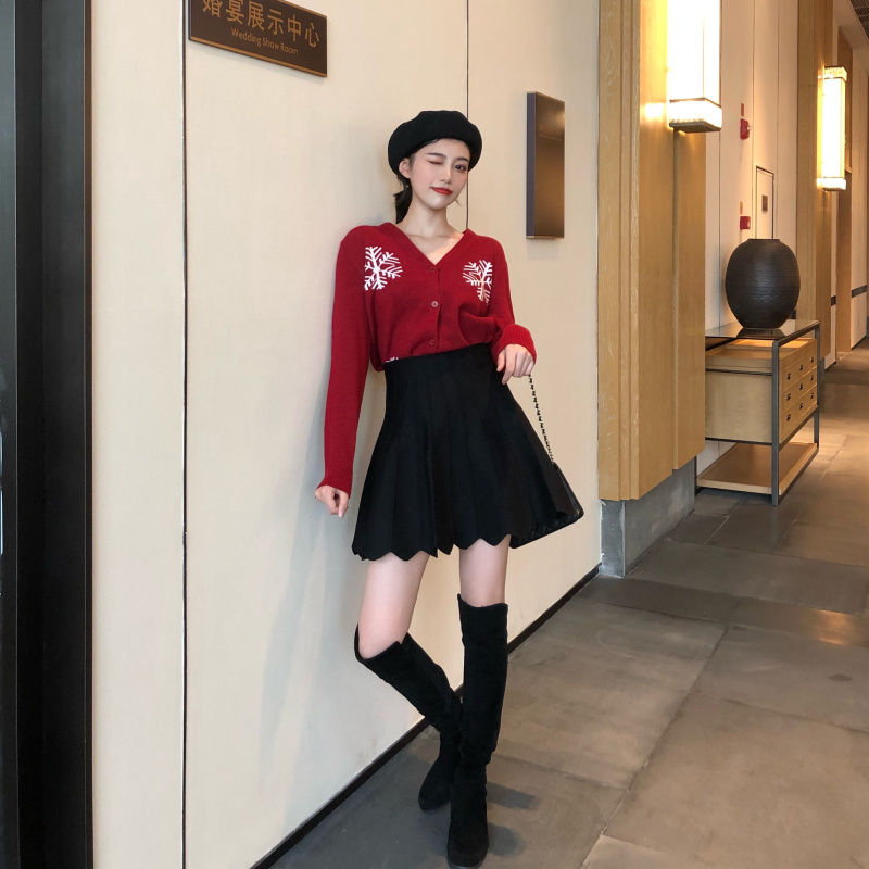 / 韓版chic女神套裝新款修身百搭雪花針織衫開衫+高腰半身裙兩件套