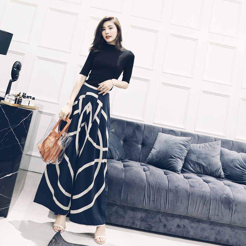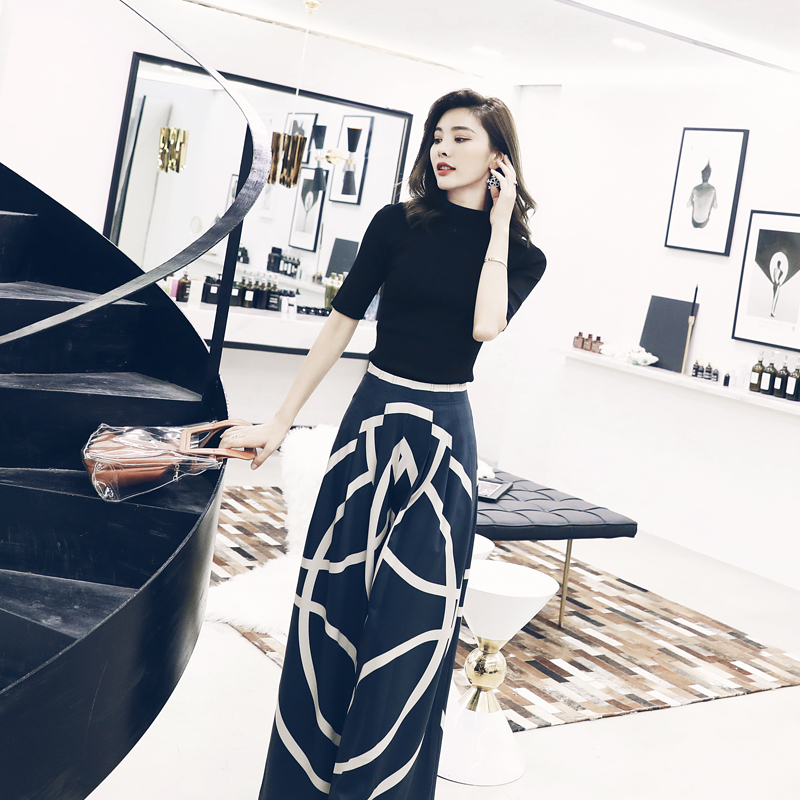 S秀名媛女神范心機套裝2018新款上衣印花垂感闊腿褲子時尚兩件套