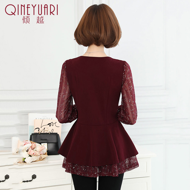 / 傾越2017春裝新款女裝潮蕾絲打底衫女士長袖中長款春季雪紡衫上衣