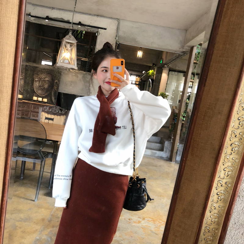 / 韓版加絨寬松人像圖案圍脖衛衣高腰純色包臀裙時尚套裝chic兩件套