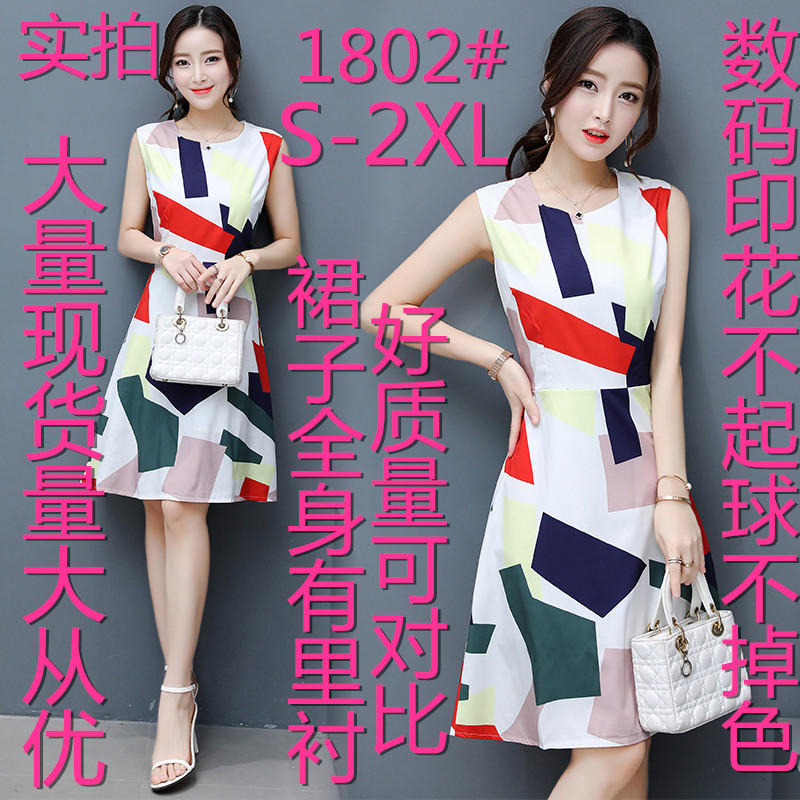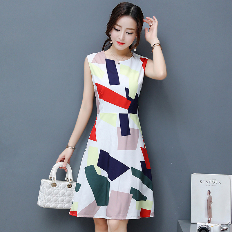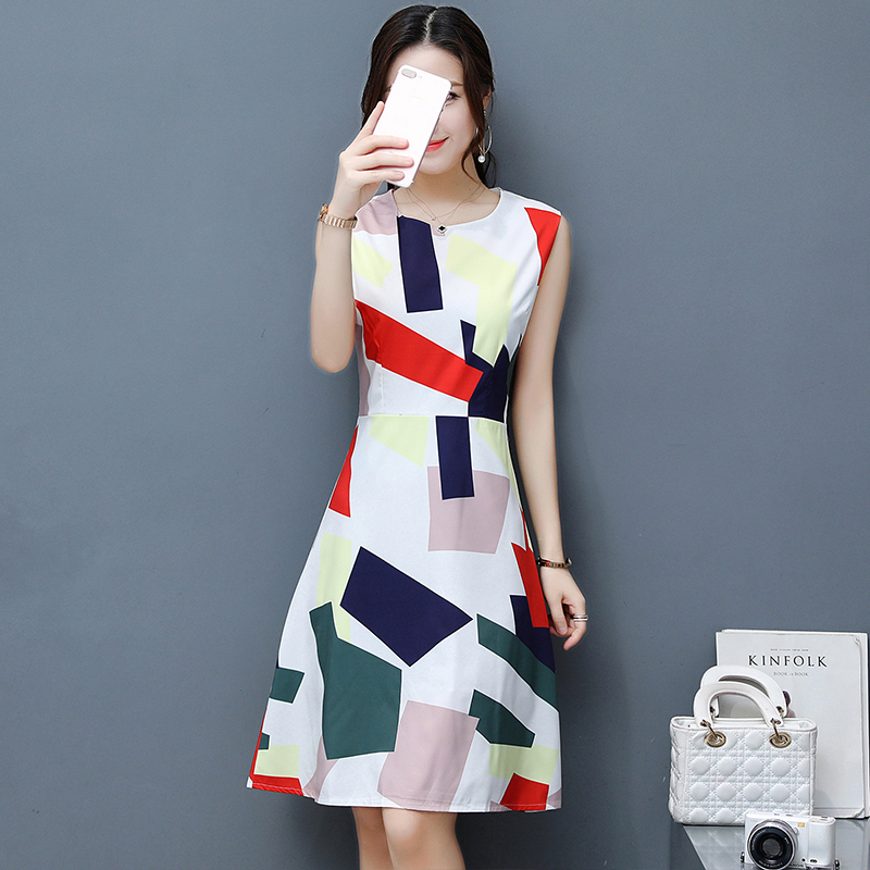 / 夏季新款名媛氣質a字裙無袖修身時尚印花中長款韓版連衣裙女