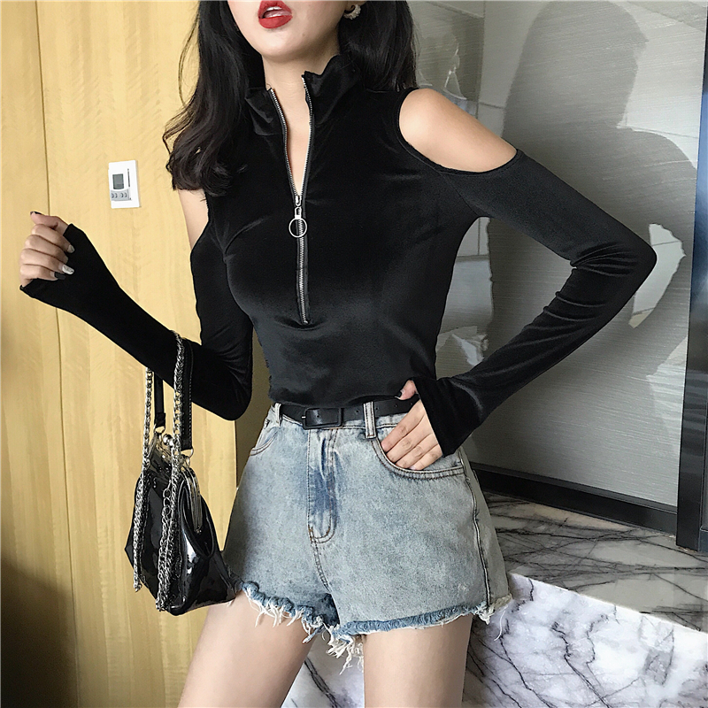 / 港味秋冬新款韓版時尚chic修身性感上衣領口拉鏈小高領露肩打底衫