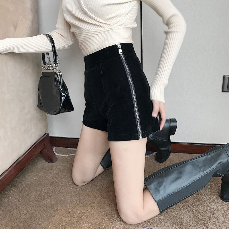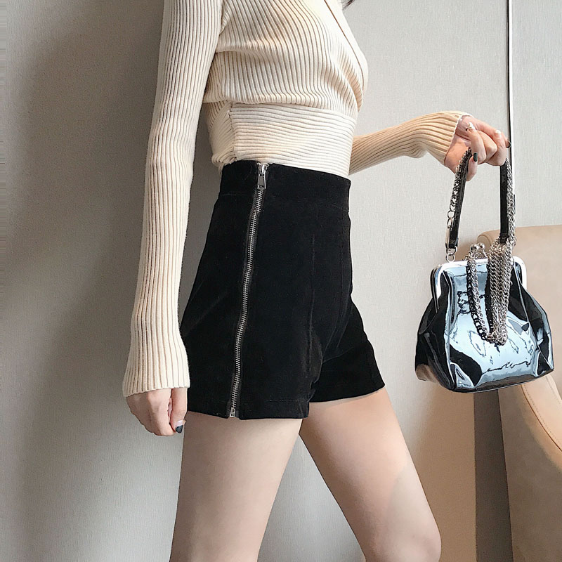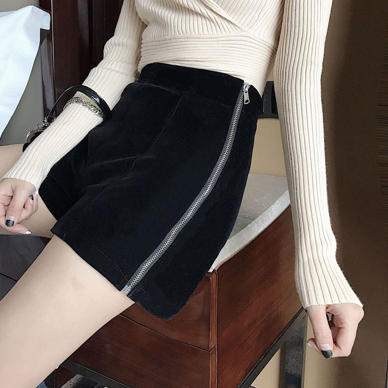 chic秋冬季2018新款褲子時尚絲絨雙拉鏈短褲純色百搭休閑闊腿褲女