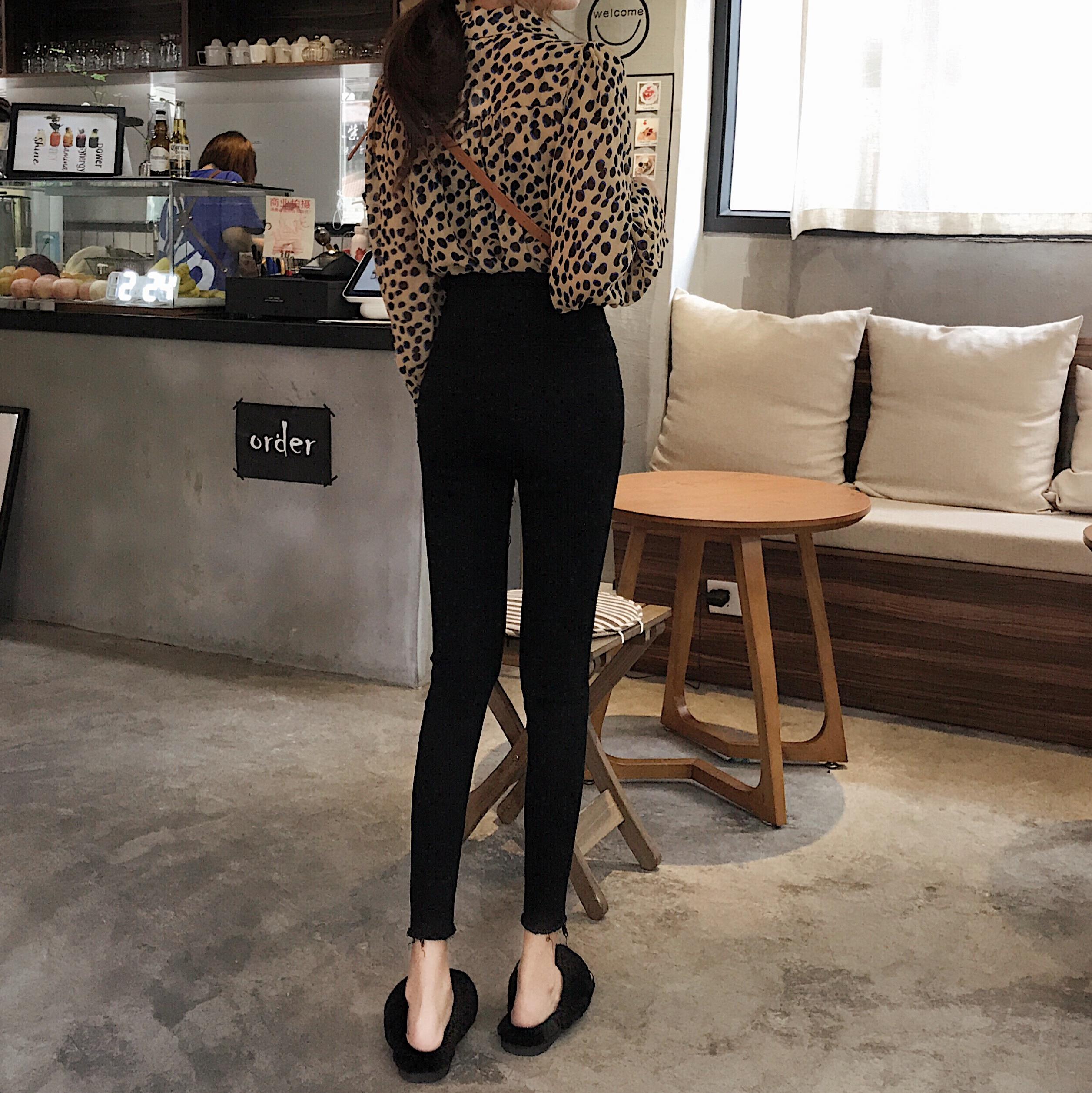 韓版拉鏈破洞黑色牛仔褲女小腳褲緊身鉛筆褲修身顯瘦高腰九分褲子