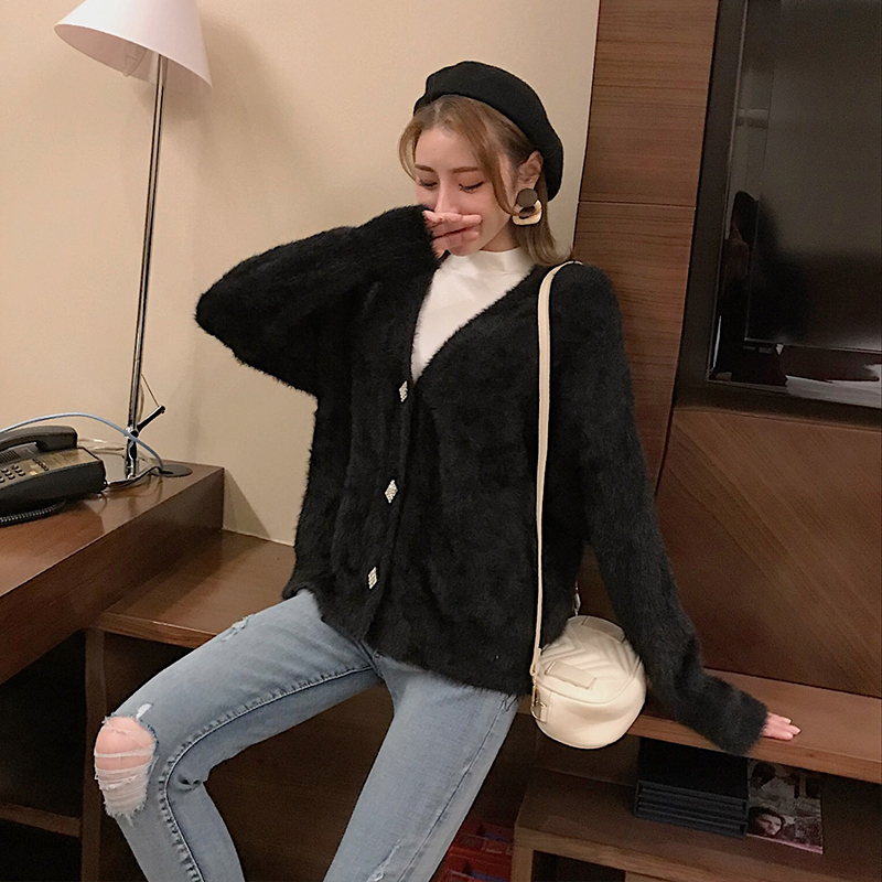 秋冬新款韓版百搭寬松V領時尚開衫甜美毛毛外套保暖加厚chic毛衣