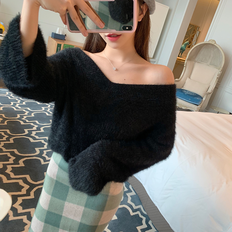 慵懶小性感一字領露肩V領針織毛衣+毛呢格子修身半身裙時尚兩件套