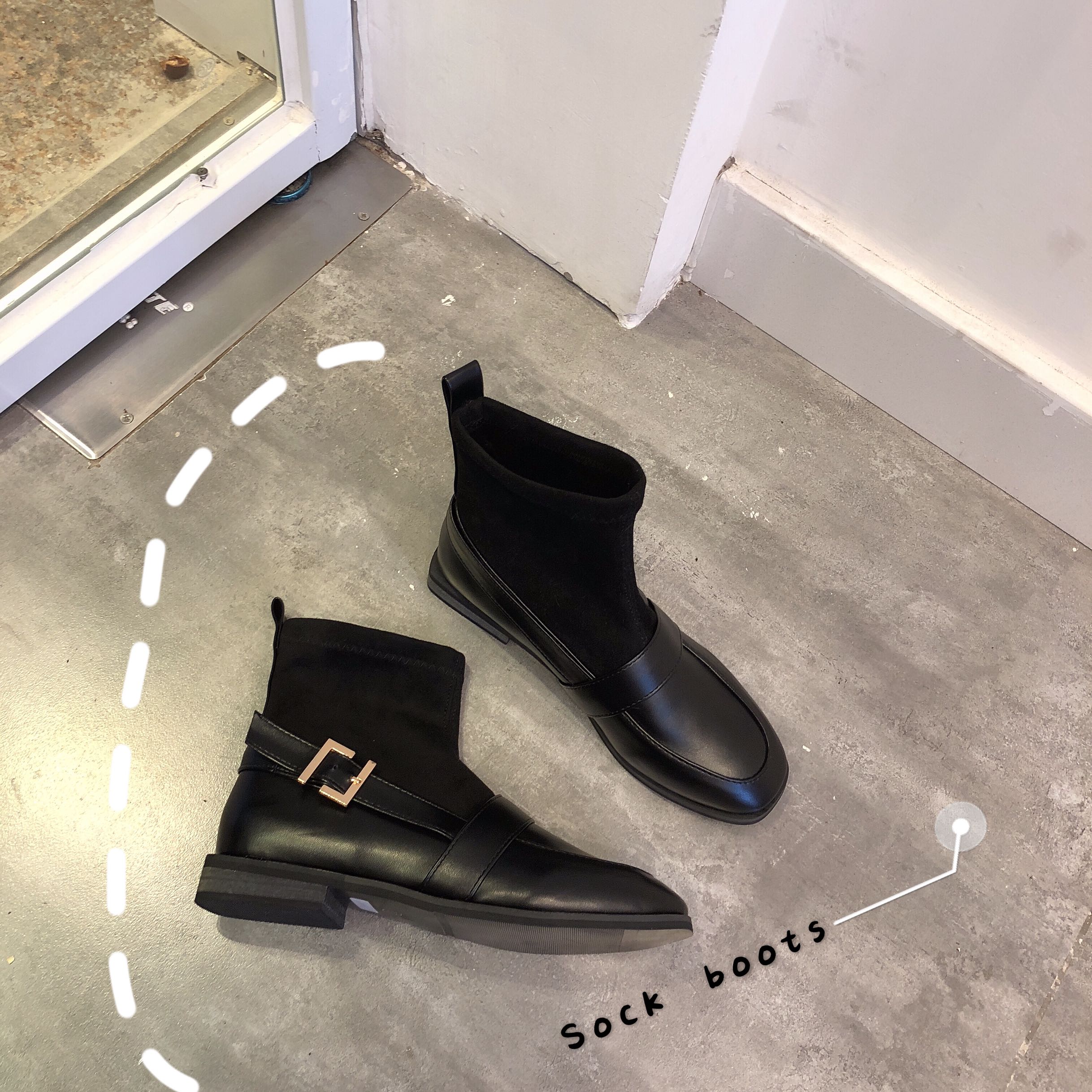 / 新款韓版網紅同款彈力靴時尚女鞋黑色瘦瘦靴方頭中筒皮帶扣短靴潮