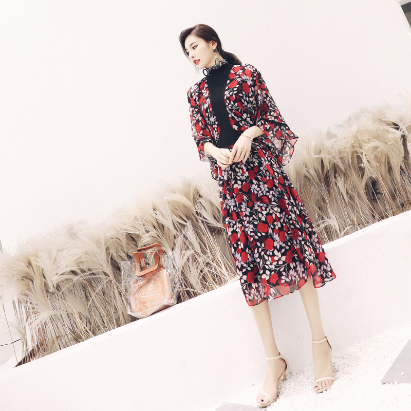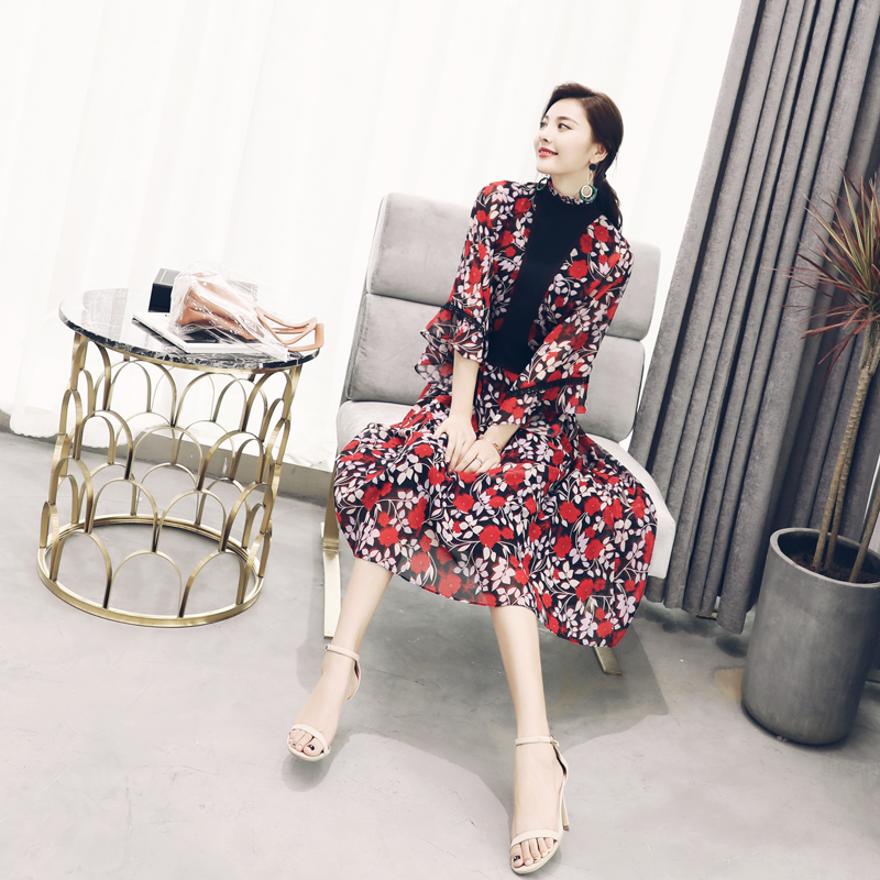 S秀2018夏裝新款復古時尚蝙蝠袖印花裙中高腰顯瘦雪紡連衣裙子