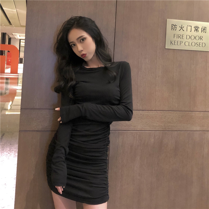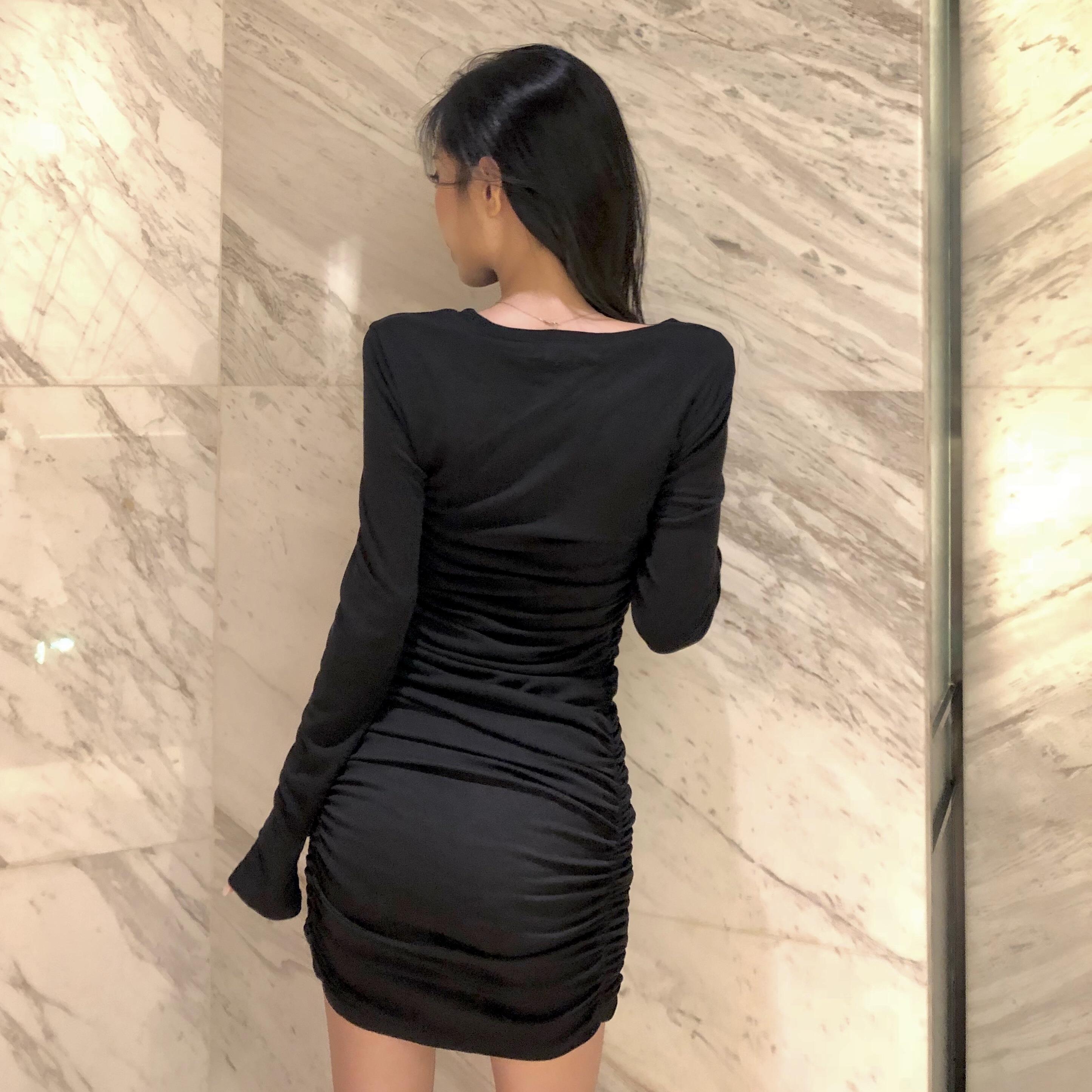 / 秋天港味新品chic高端大氣修身溫柔復古拉皺針織中長款純色連衣裙
