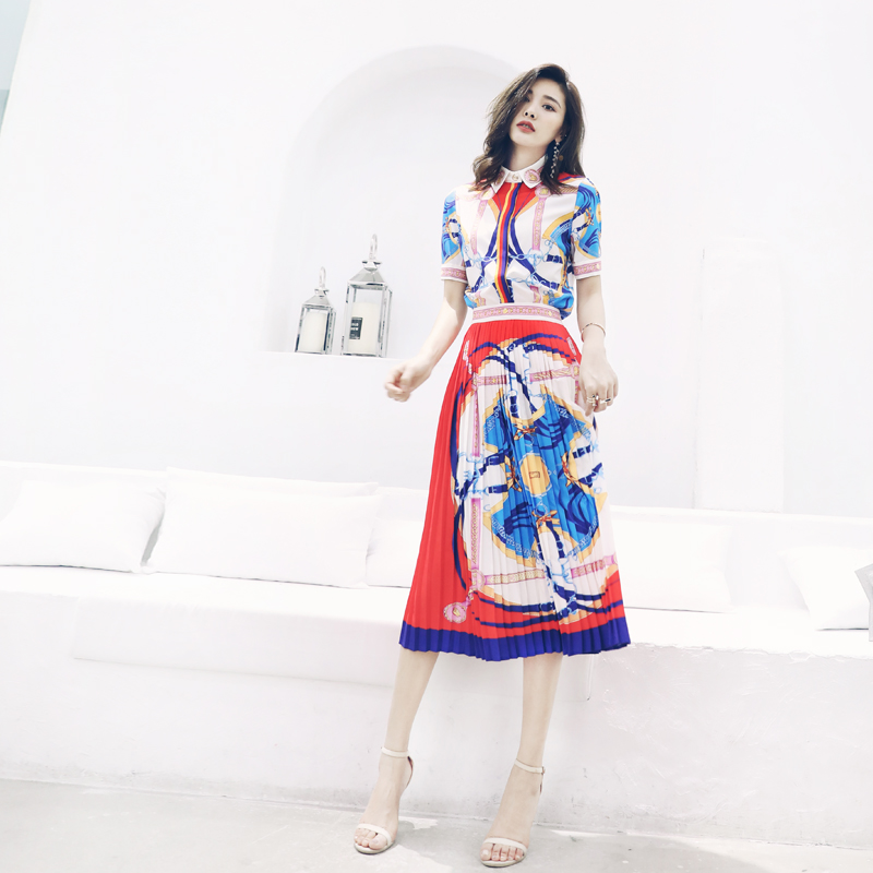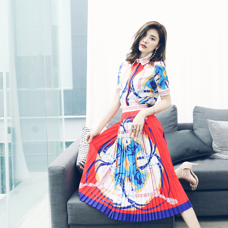 s秀2018新款女裝時尚印花短袖T恤兩件套修身套裝裙百褶半身裙夏潮