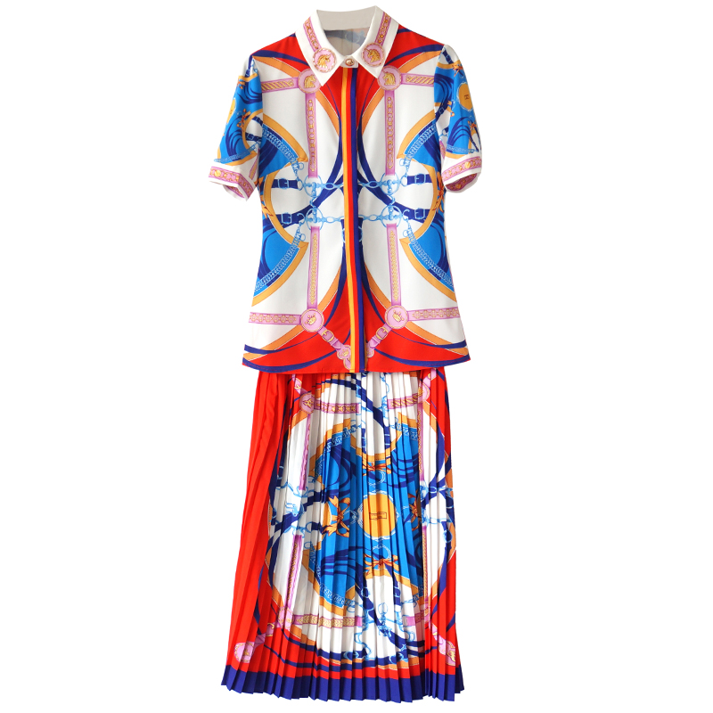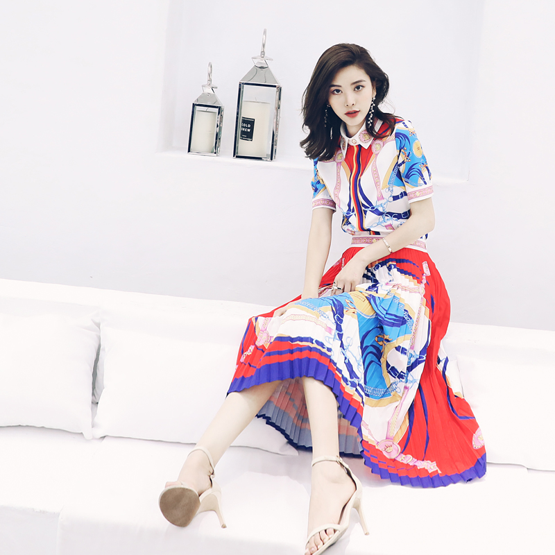 / s秀2018新款女裝時尚印花短袖T恤兩件套修身套裝裙百褶半身裙夏潮