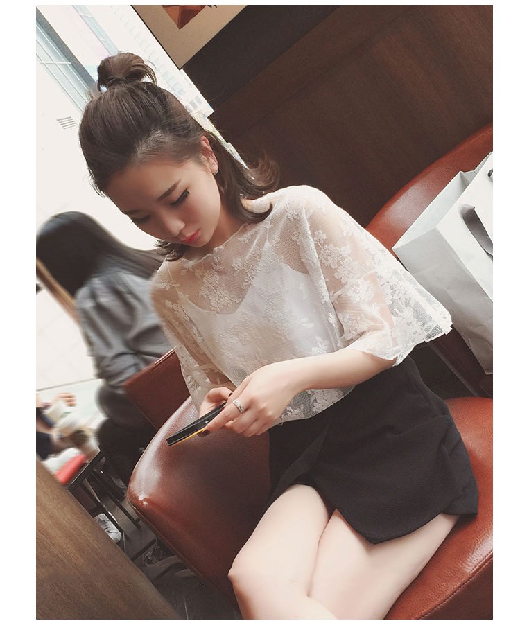 夏季新款韓版寬松百搭雪紡衫短袖蕾絲衫吊帶背心兩件套蕾絲上衣女