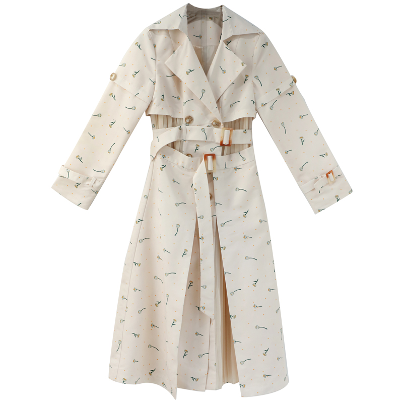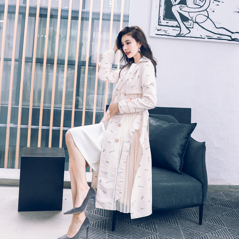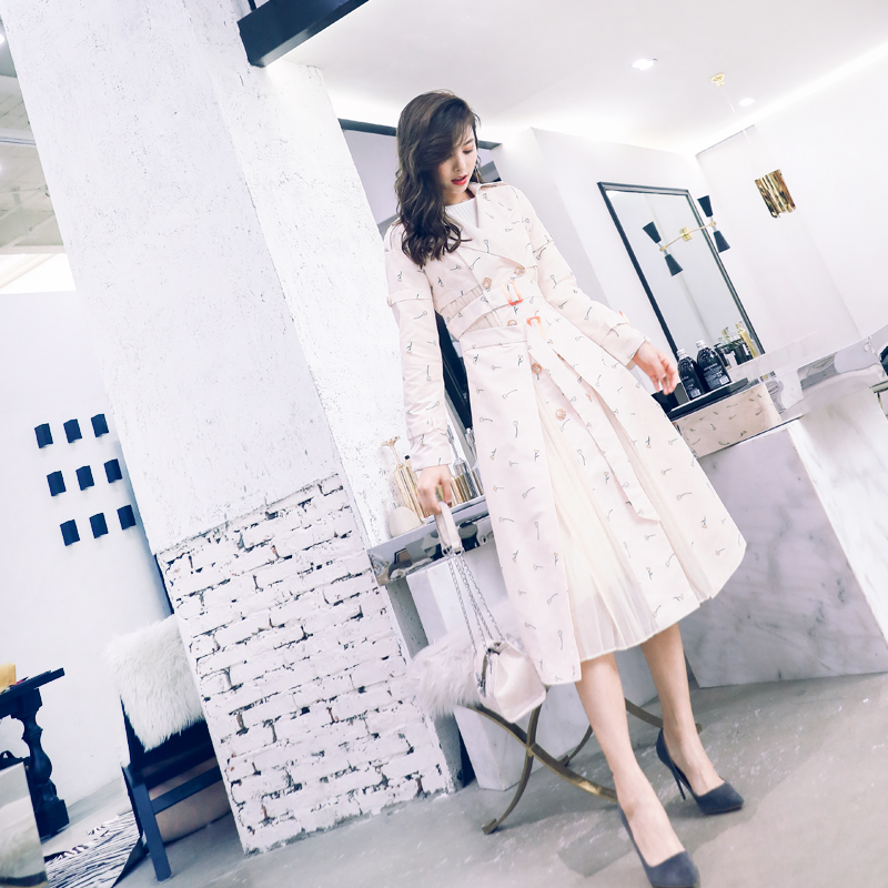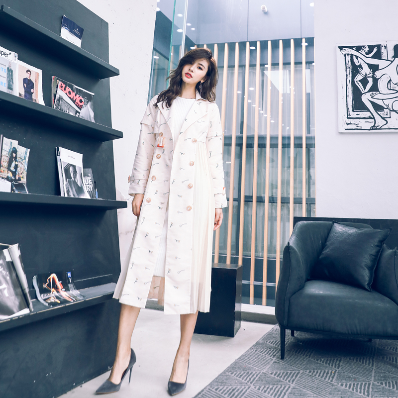 / 名媛2018秋冬新款歐美女裝中長外套長袖收腰顯瘦復古印花風衣大衣