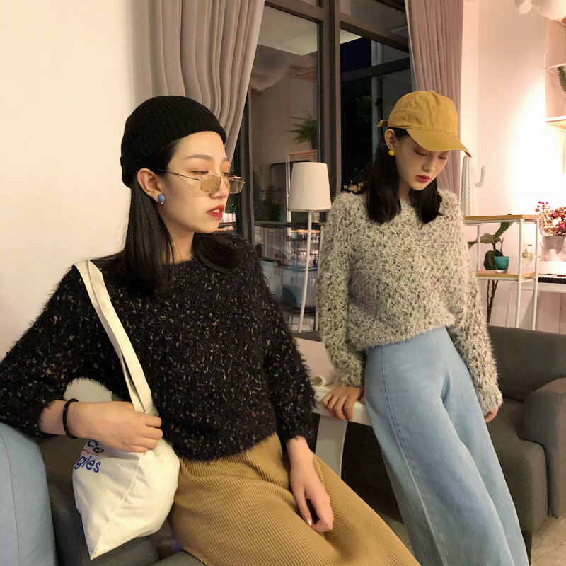 秋冬新款韓版復古女裝港味粗線寬松短款百搭上衣加厚彩虹點毛衣潮