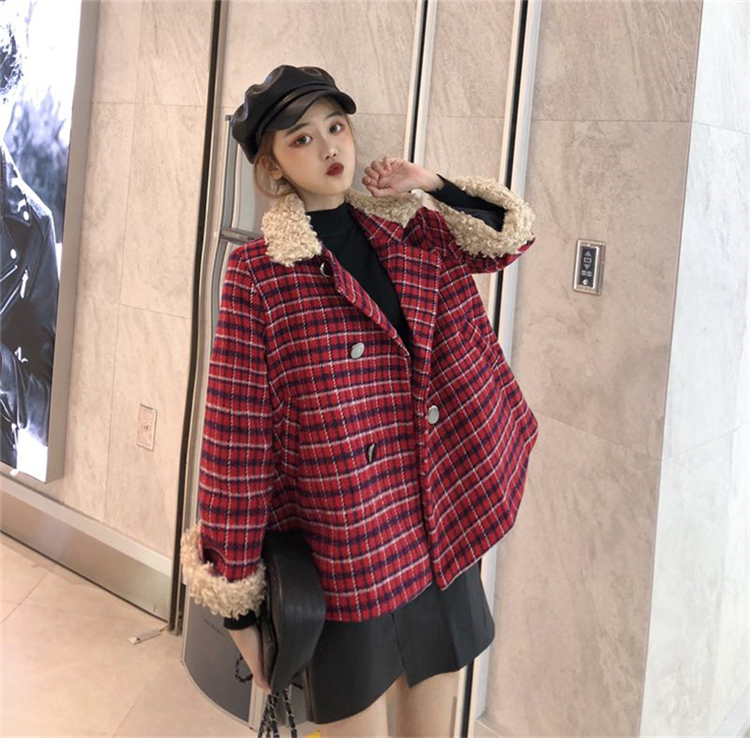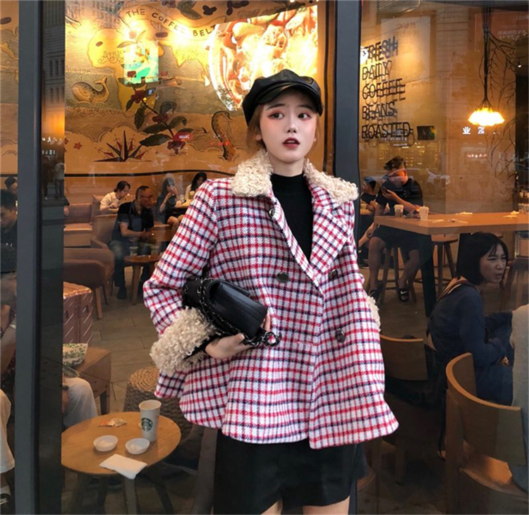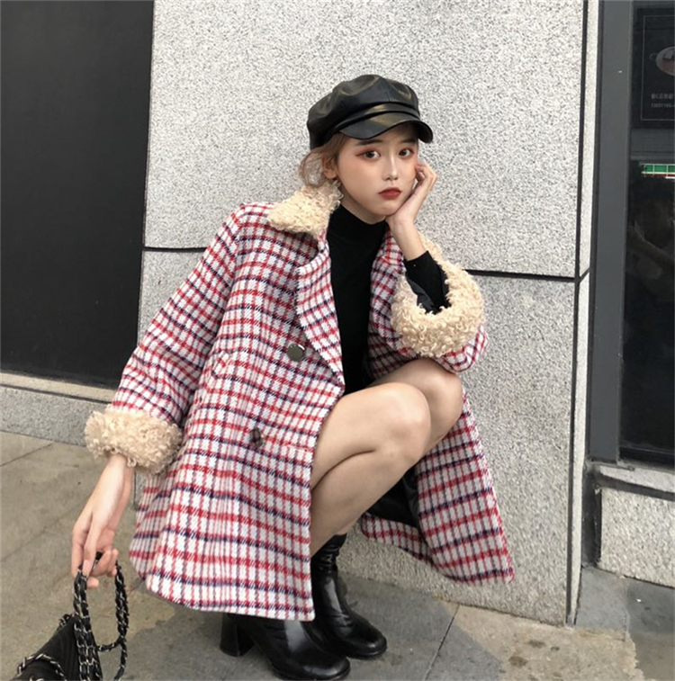 / 2018秋裝新款韓版雙排扣翻領格子大衣毛呢半高領修身打底T恤套裝